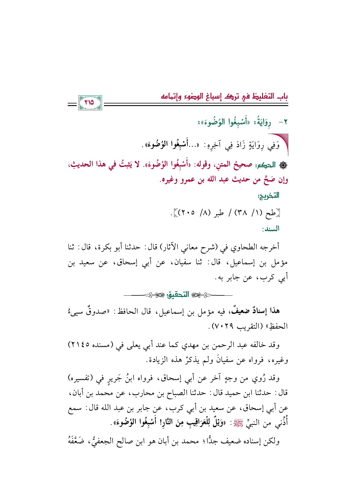 وقد رُوي من وجهٍ آخر عن أبي إسحاق، فرواه ابنُ جَريرٍ في (تفسيره) قال: حدثنا ابن حميد قال: حدثنا الصباح بن محارب، عن محمد بن أبان، عن أبي إسحاق، عن سعيد بن أبي كرب، عن جابر بن عبد الله قال: سمع أُذُني من النبيِّ صلى الله عليه وسلم: ((وَيْلٌ لِلْعَرَاقِيبِ مِنَ النَّارِ! أَسْبِغُوا الوُضُوءَ)).