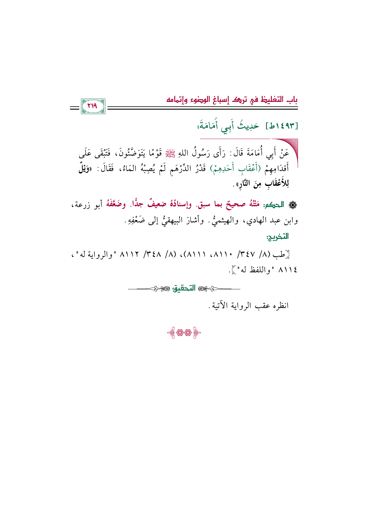 ◼ عَنْ أَبِي أُمَامَةَ قَالَ: رَأَى رَسُولُ اللهِ صلى الله عليه وسلم قَوْمًا يَتَوَضَّئُونَ، فَتَبْقَى عَلَى أَقدَامِهِمْ (أَعْقَابِ أَحَدِهِمْ) قَدْرُ الدِّرْهَمِ لَمْ يُصِبْهُ المَاءُ، فَقَالَ: «وَيْلٌ لِلأَعْقَابِ مِنَ النَّارِ».