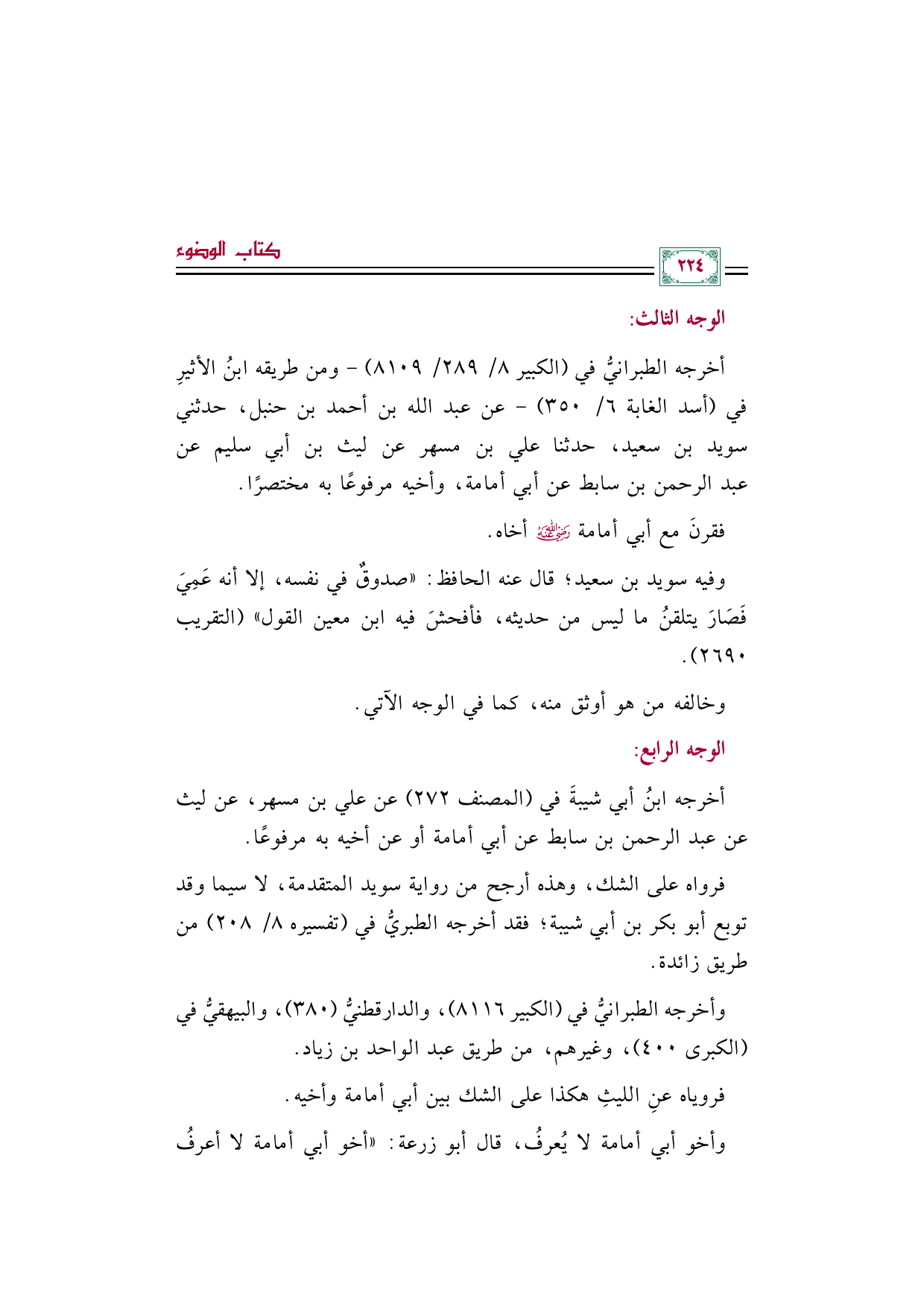 أخرجه الطبرانيُّ في (الكبير ٨/ ٢٨٩/ ٨١٠٩) -ومن طريقه ابنُ الأثيرِ في (أسد الغابة ٦/ ٣٥٠) - عن عبد الله بن أحمد بن حنبل، حدثني سويد بن سعيد، حدثنا علي بن مسهر عن ليث بن أبي سليم عن عبد الرحمن بن سابط عن أبي أمامة، وأخيه مرفوعًا به مختصرًا.