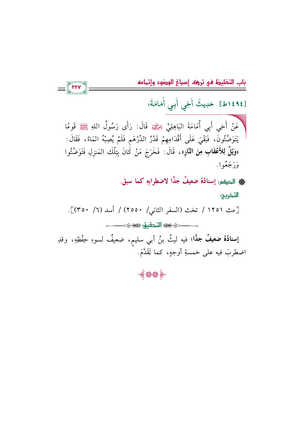 ◼ عَنْ أَخِي أَبِي أُمَامَةَ البَاهِلِيِّ رضي الله عنه قَالَ: رَأَى رَسُولُ اللهِ صلى الله عليه وسلم قَومًا يَتَوَضَّئُونَ، فَبَقَيَ عَلَى أَقْدَامِهِمْ قَدْرُ الدِّرْهَمِ فَلَمْ يُصِبْهُ المَاءُ، فَقَالَ: «وَيْلٌ لِلأَعْقَابِ مِنَ النَّارِ»، قَالَ: فَخَرَجَ مَنْ كَانَ بِتِلْكَ المَنزِلِ فَتَوَضَّئُوا وَرَجَعُوا.