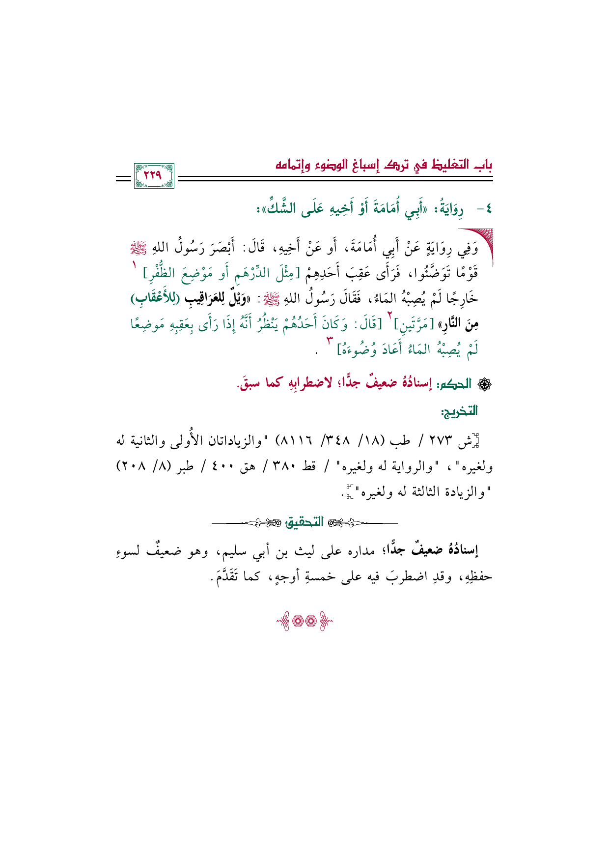 • وَفِي رِوَايَةٍ عَنْ أَبِي أُمَامَةَ، أَو عَنْ أَخِيهِ، قَالَ: أَبْصَرَ رَسُولُ اللهِ صلى الله عليه وسلم قَوْمًا تَوَضَّئُوا، فَرَأَى عَقِبَ أَحَدِهِمْ [مِثْلَ الدِّرْهَمِ أَو مَوْضِعَ الظُّفْرِ [١ خَارِجًا لَمْ يُصِبْهُ المَاءُ، فَقَالَ رَسُولُ اللهِ صلى الله عليه وسلم: «وَيْلٌ لِلعَرَاقِيبِ (لِلأَعْقَابِ) مِنَ النَّارِ»] مَرَّتَينِ] ٢ [قَالَ: وَكَانَ أَحَدُهُمْ يَنْظُرُ أَنَّهُ إِذَا رَأَى بِعَقِبِهِ مَوضِعًا لَمْ يُصِبْهُ المَاءُ أَعَادَ وُضُوءَهُ [٣.