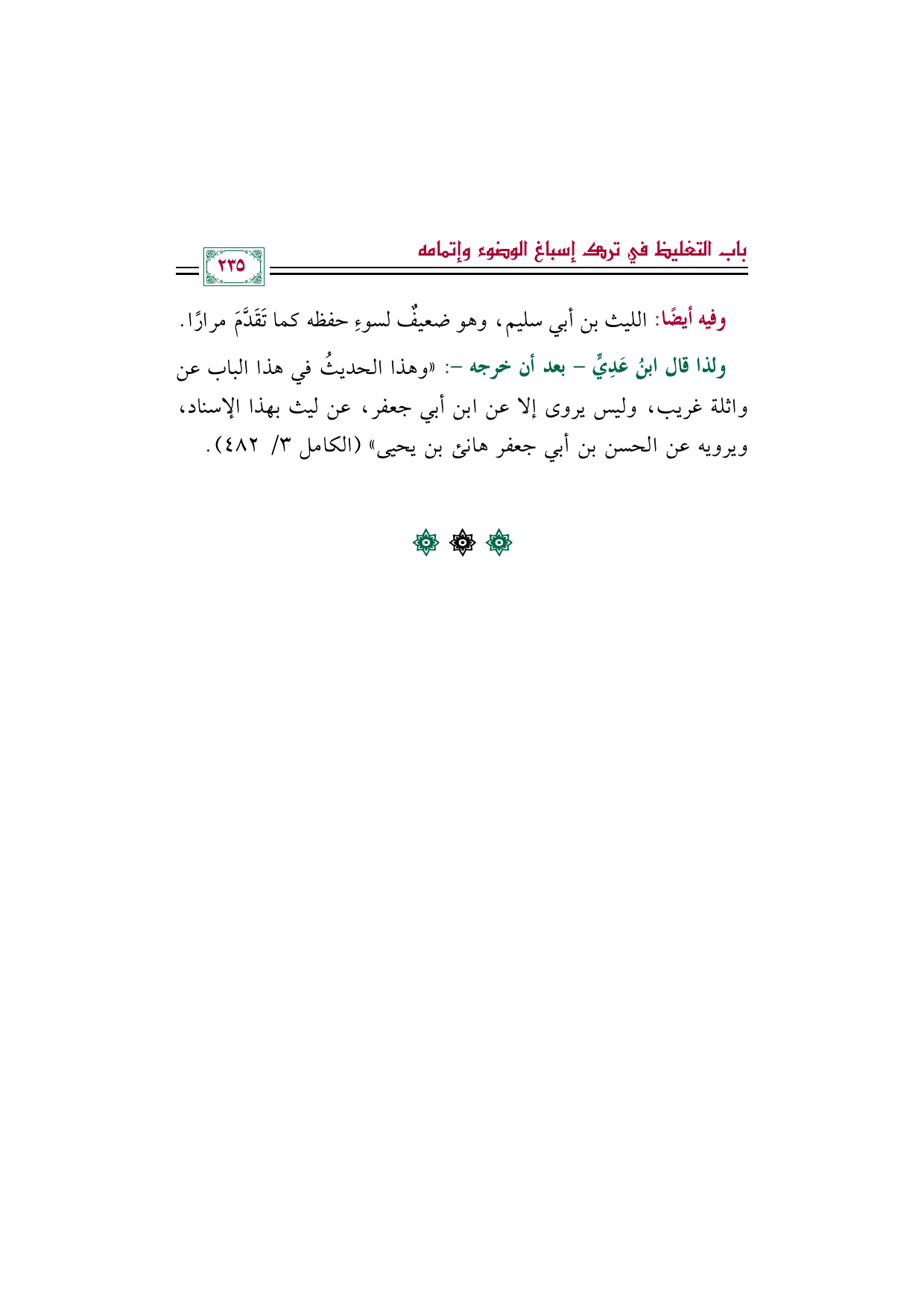ولذا قال ابنُ عَدِيٍّ -بعد أن خرجه-: "وهذا الحديثُ في هذا الباب عن واثلة غريب، وليس يروى إلا عن ابن أبي جعفر، عن ليث بهذا الإسناد، ويرويه عن الحسن بن أبي جعفر هانئ بن يحيى" (الكامل ٣/ ٤٨٢).