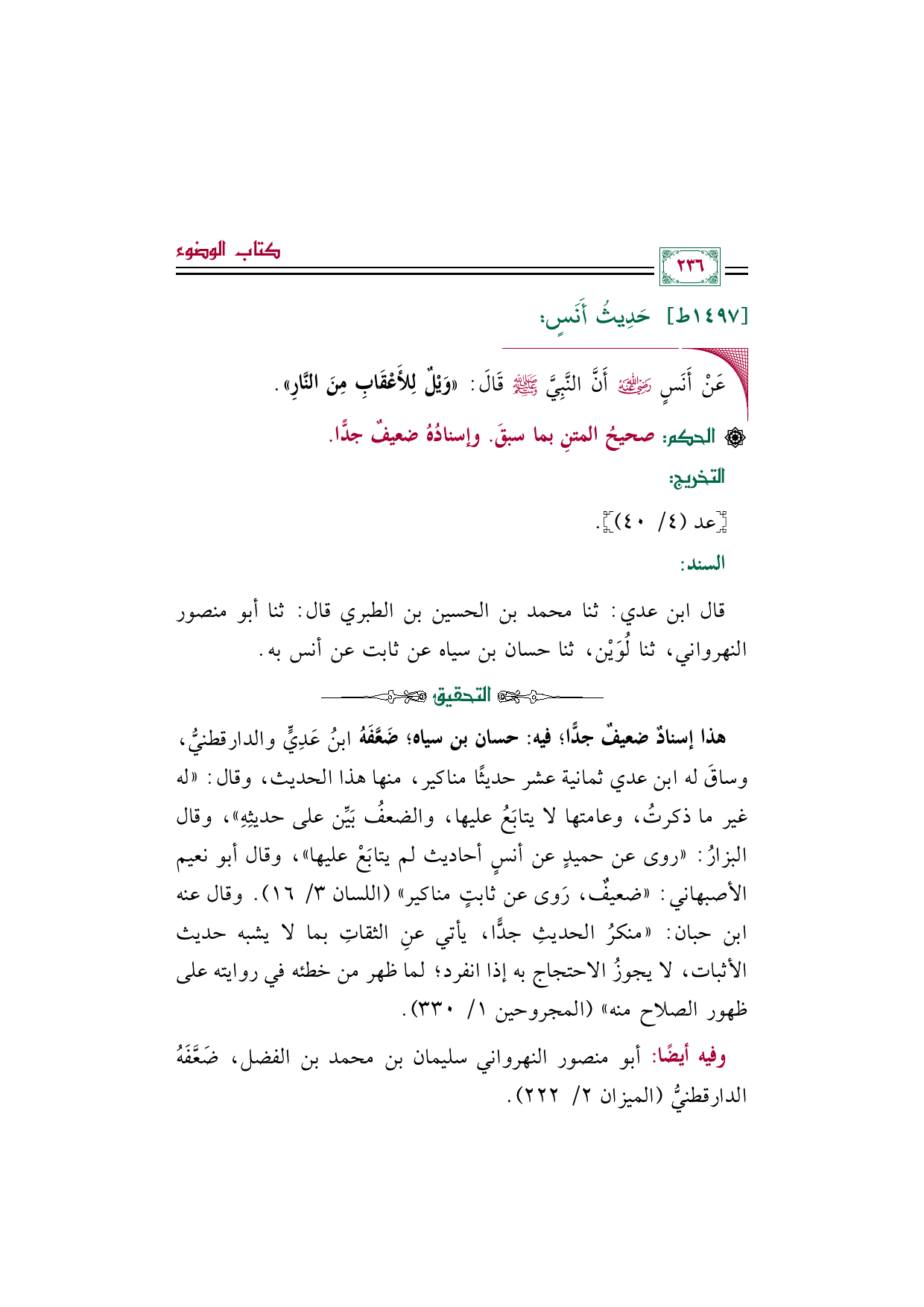 ◼ عَنْ أَنَسٍ رضي الله عنه أَنَّ النَّبِيَّ صلى الله عليه وسلم قَالَ: «وَيْلٌ لِلأَعْقَابِ مِنَ النَّارِ».