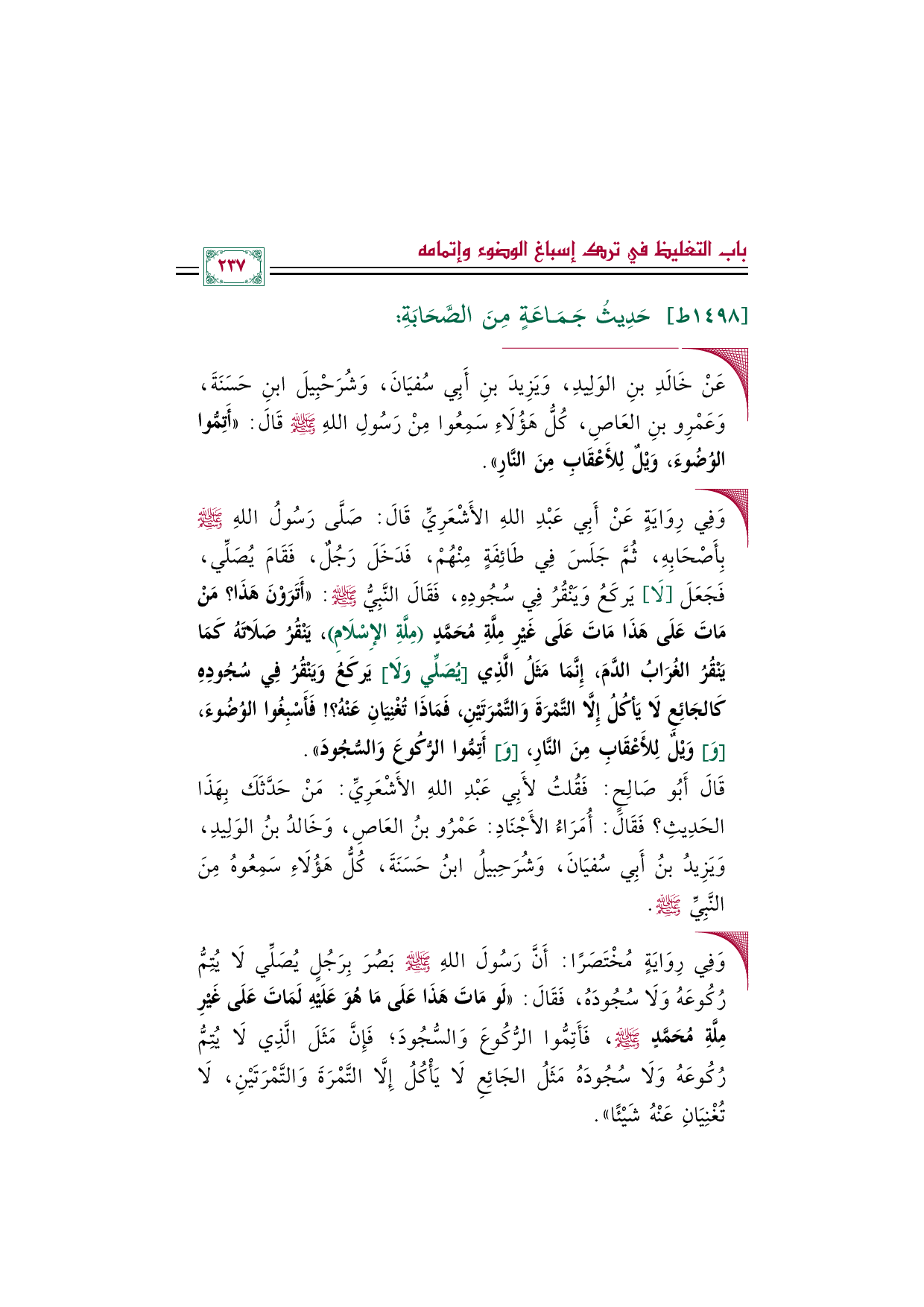 • وَفِي رِوَايَةٍ عَنْ أَبِي عَبْدِ اللهِ الأَشْعَرِيِّ قَالَ: صَلَّى رَسُولُ اللهِ صلى الله عليه وسلم بِأَصْحَابِهِ، ثُمَّ جَلَسَ فِي طَائِفَةٍ مِنْهُمْ، فَدَخَلَ رَجُلٌ، فَقَامَ يُصَلِّي، فَجَعَلَ [لَا] يَركَعُ وَيَنْقُرُ فِي سُجُودِهِ، فَقَالَ النَّبِيُّ صلى الله عليه وسلم: «أَتَرَوْنَ هَذَا؟ مَنْ مَاتَ عَلَى هَذَا مَاتَ عَلَى غَيْرِ مِلَّةِ مُحَمَّدٍ (مِلَّةِ الإِسْلَامِ)، يَنْقُرُ صَلَاتَهُ كَمَا يَنْقُرُ الغُرَابُ الدَّمَ، إِنَّمَا مَثَلُ الَّذِي [يُصَلِّي وَلَا] يَركَعُ وَيَنْقُرُ فِي سُجُودِهِ كَالجَائِعِ لَا يَأكُلُ إِلَّا التَّمْرَةَ وَالتَّمْرَتَيْنِ، فَمَاذَا تُغْنِيَانِ عَنْهُ؟ ! فَأَسْبِغُوا الوُضُوءَ، [وَ] وَيْلٌ لِلأَعْقَابِ مِنَ النَّارِ، [وَ] أَتِمُّوا الرُّكُوعَ وَالسُّجُودَ».