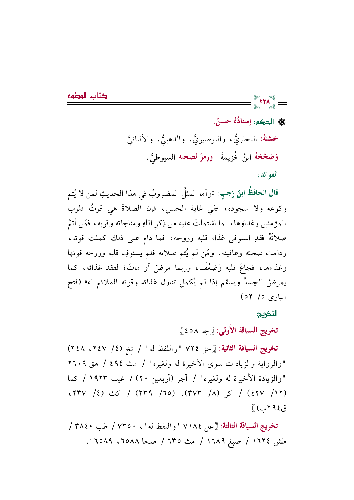 قال الحافظُ ابنُ رَجبٍ: "وأما المثلُ المضروبُ في هذا الحديثِ لمن لا يُتم ركوعه ولا سجوده، ففي غاية الحسن، فإن الصلاةَ هي قوتُ قلوب المؤمنين وغذاؤها، بما اشتملتْ عليه من ذِكرِ اللهِ ومناجاته وقربه، فمَن أتمَّ صلاتَهُ فقدِ استوفى غذاء قلبه وروحه، فما دام على ذلك كملت قوته، ودامت صحته وعافيته. ومَن لم يُتم صلاته فلم يستوفِ قلبه وروحه قوتها وغذاءها، فجاعَ قلبه وَضعُفَ، وربما مرضَ أو ماتَ؛ لفقد غذائه، كما يمرضُ الجسدُ ويسقم إذا لم يُكمل تناول غذائه وقوته الملائم له" (فتح الباري ٥/ ٥٢).