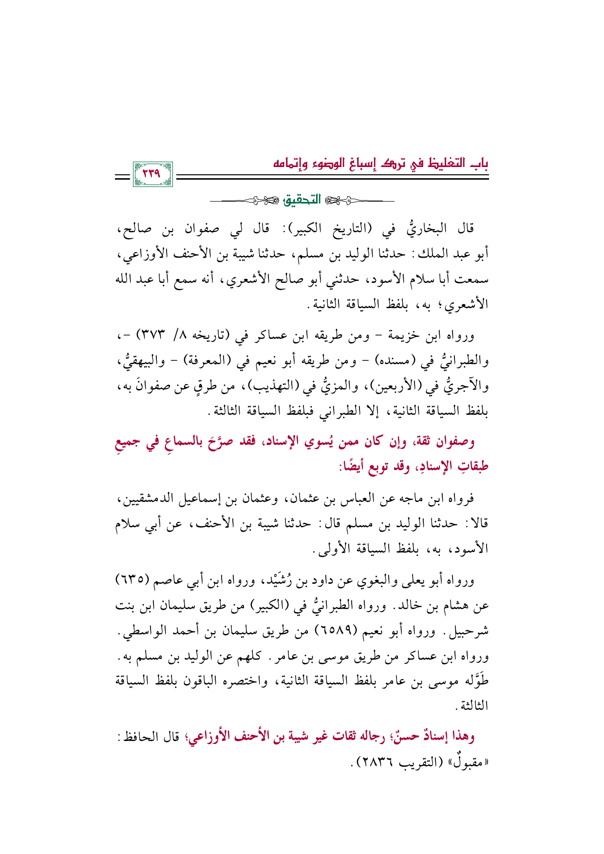 قال البخاريُّ في (التاريخ الكبير): قال لي صفوان بن صالح، أبو عبد الملك: حدثنا الوليد بن مسلم، حدثنا شيبة بن الأحنف الأوزاعي، سمعت أبا سلام الأسود، حدثني أبو صالح الأشعري، أنه سمع أبا عبد الله الأشعري؛ به، بلفظ السياقة الثانية.