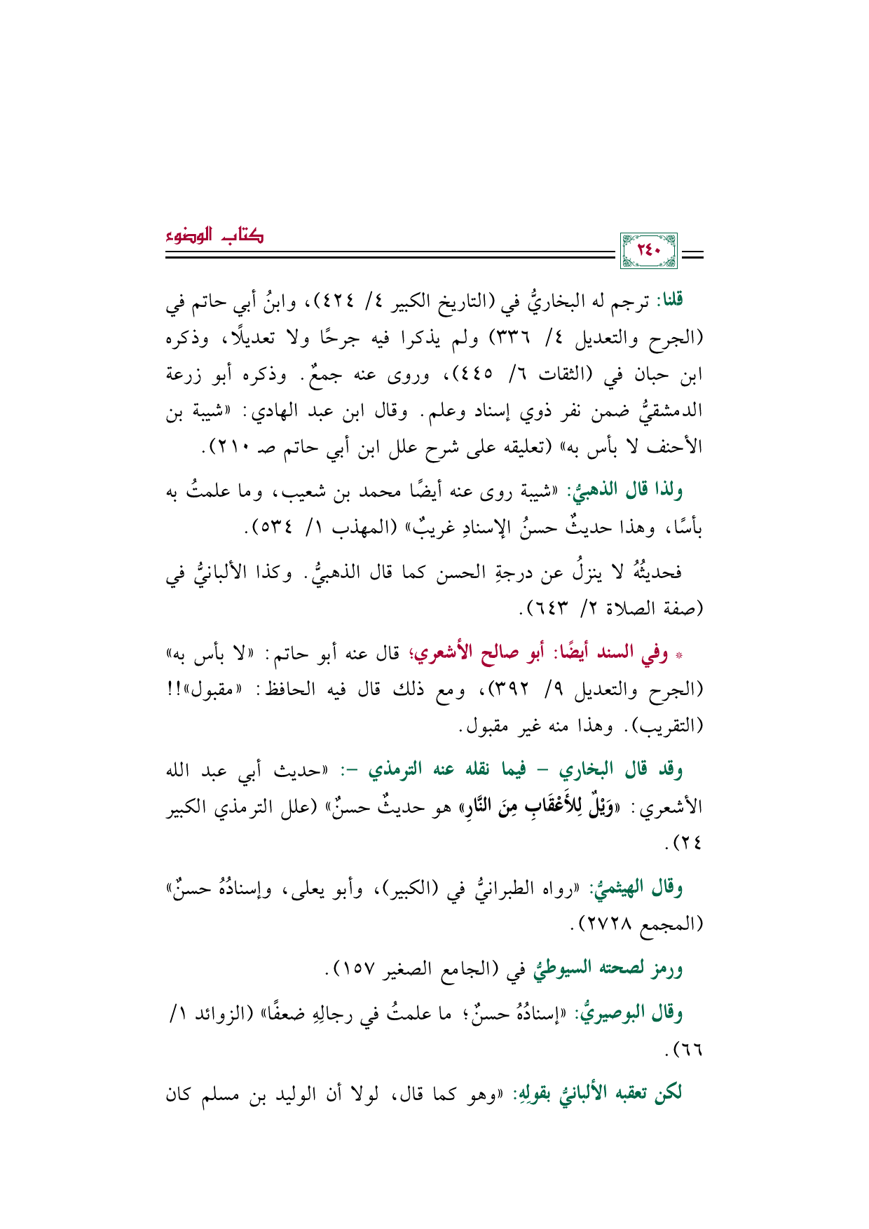 * وفي السند أيضًا: أبو صالح الأشعري؛ قال عنه أبو حاتم: "لا بأس به" (الجرح والتعديل ٩/ ٣٩٢)، ومع ذلك قال فيه الحافظ: "مقبول"! ! (التقريب). وهذا منه غير مقبول.