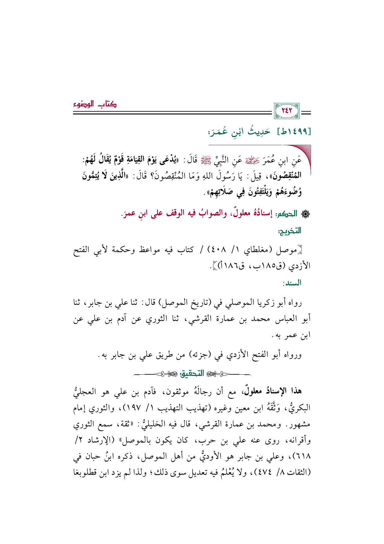 هذا الإسنادُ معلولٌ، مع أن رجالَهُ موثقون، فآدم بن علي هو العجليُّ البكريُّ، وَثَّقَهُ ابن معين وغيره (تهذيب التهذيب ١/ ١٩٧)، والثوري إمام مشهور. ومحمد بن عمارة القرشي، قال فيه الخليليُّ: "ثقة، سمع الثوري وأقرانه، روى عنه علي بن حرب، كان يكون بالموصل" (الإرشاد ٢/ ٦١٨)، وعلي بن جابر هو الأوديُّ من أهل الموصل، ذكره ابنُ حبان في (الثقات ٨/ ٤٧٤)، ولا يُعْلمُ فيه تعديل سوى ذلك؛ ولذا لم يزد ابن قطلوبغا