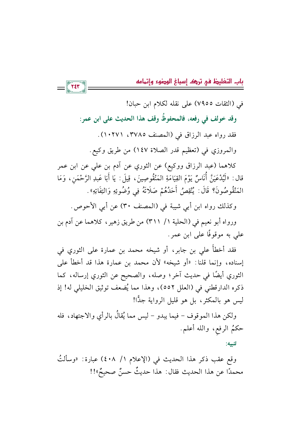 كلاهما (عبد الرزاق ووكيع) عن الثوري عن آدم بن علي عن ابن عمر قال: «لَيُدْعَيَنَّ أُنَاسٌ يَوْمَ القِيَامَةِ المَنْقُوصِينَ، قِيلَ: يَا أَبَا عَبدِ الرَّحْمَنِ، وَمَا المَنْقُوصُونَ؟ قَالَ: يُنْقِصُ أَحَدُهُمْ صَلَاتَهُ فِي وُضُوئِهِ وَالتِفَاتِهِ».