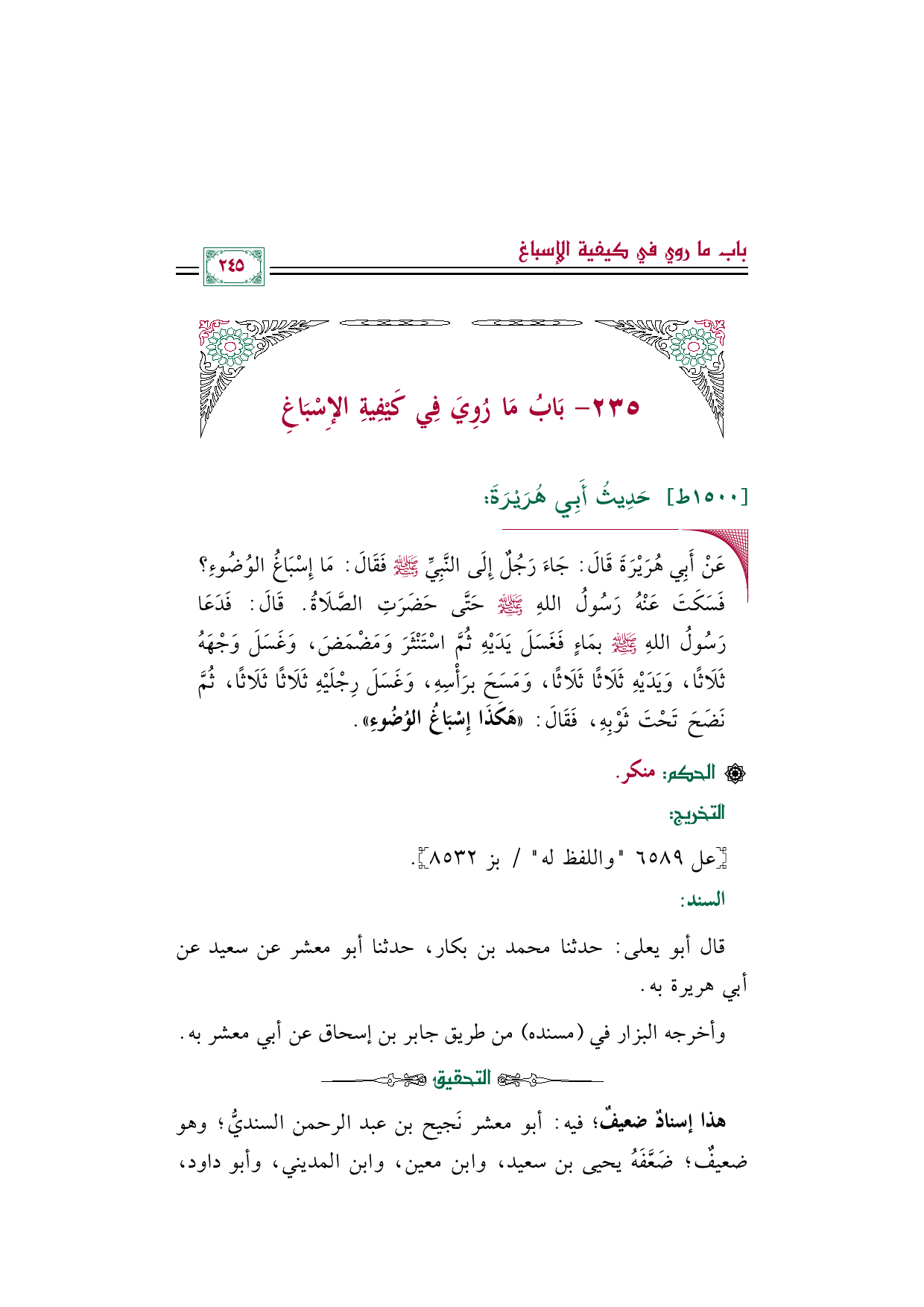 ◼ عَنْ أَبِي هُرَيْرَةَ قَالَ: جَاءَ رَجُلٌ إِلَى النَّبِيِّ صلى الله عليه وسلم فَقَالَ: مَا إِسْبَاغُ الوُضُوءِ؟ فَسَكَتَ عَنْهُ رَسُولُ اللهِ صلى الله عليه وسلم حَتَّى حَضَرَتِ الصَّلَاةُ. قَالَ: فَدَعَا رَسُولُ اللهِ صلى الله عليه وسلم بمَاءٍ فَغَسَلَ يَدَيْهِ ثُمَّ اسْتَنْثَرَ وَمَضْمَضَ، وَغَسَلَ وَجْهَهُ ثَلَاثًا، وَيَدَيْهِ ثَلَاثًا ثَلَاثًا، وَمَسَحَ برَأْسِهِ، وَغَسَلَ رِجْلَيْهِ ثَلَاثًا ثَلَاثًا، ثُمَّ نَضَحَ تَحْتَ ثَوْبِهِ، فَقَالَ: «هَكَذَا إِسْبَاغُ الوُضُوءِ».
