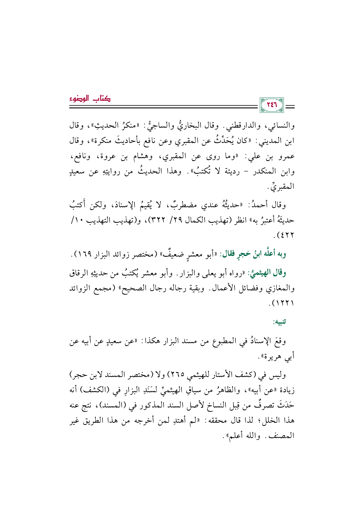 والنسائي، والدارقطني. وقال البخاريُّ والساجيُّ: "منكرُ الحديثِ"، وقال ابن المديني: " كان يُحَدِّثُ عن المقبري وعن نافع بأحاديثَ منكرة"، وقال عمرو بن علي: "وما روى عن المقبري، وهشام بن عروة، ونافع، وابن المنكدر- رديئة لا تُكتبُ". وهذا الحديثُ من روايتِهِ عن سعيدٍ المقبريِّ.