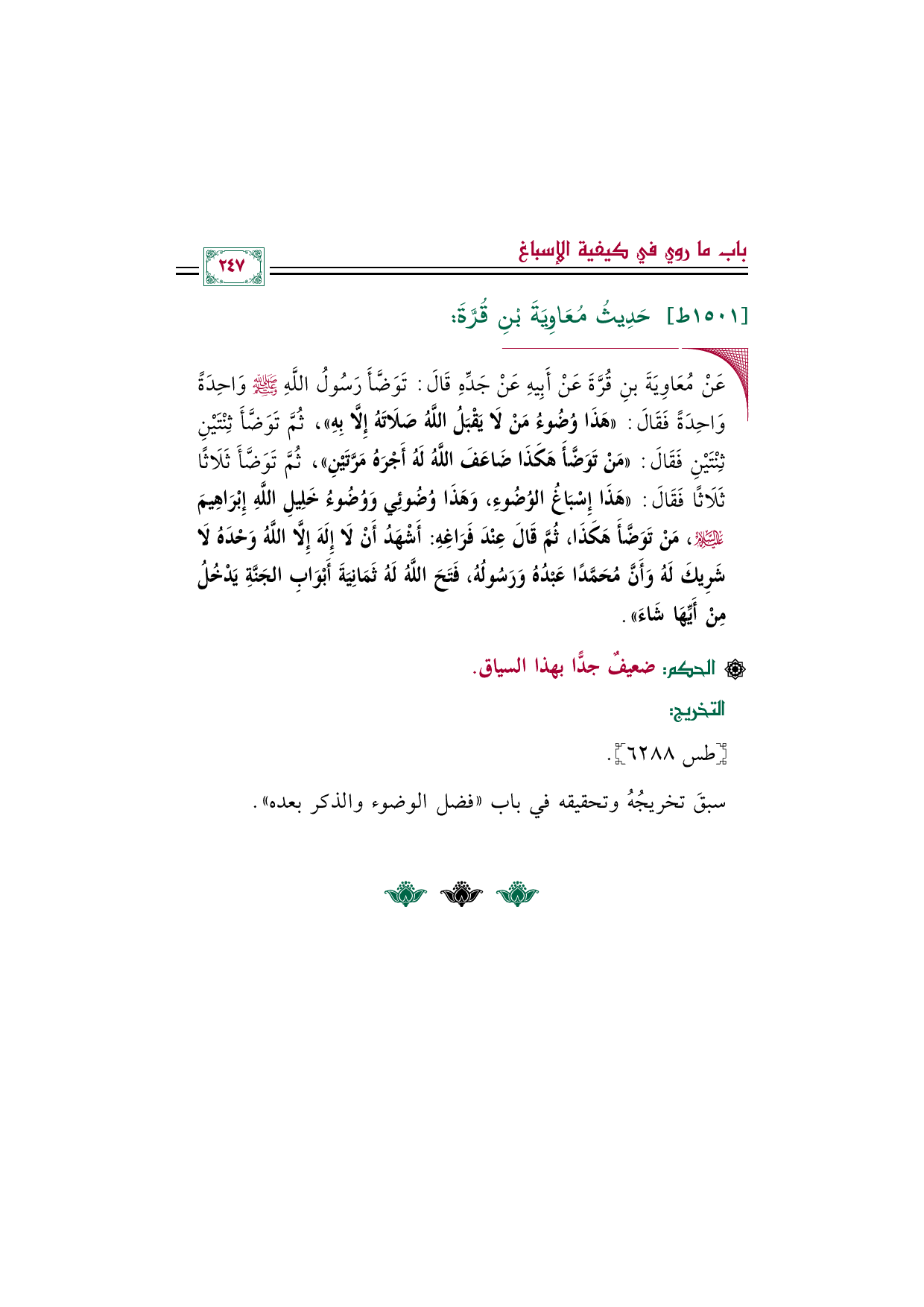 ◼ عَنْ مُعَاوِيَةَ بنِ قُرَّةَ عَنْ أَبِيهِ عَنْ جَدِّهِ قَالَ: تَوَضَّأَ رَسُولُ اللَّهِ صلى الله عليه وسلم وَاحِدَةً وَاحِدَةً فَقَالَ: «هَذَا وُضُوءُ مَنْ لَا يَقْبَلُ اللَّهُ صَلَاتَهُ إِلَّا بِهِ»، ثُمَّ تَوَضَّأَ ثِنْتَيْنِ ثِنْتَيْنِ فَقَالَ: «مَنْ تَوَضَّأَ هَكَذَا ضَاعَفَ اللَّهُ لَهُ أَجْرَهُ مَرَّتَيْنِ»، ثُمَّ تَوَضَّأَ ثَلَاثًا ثَلَاثًا فَقَالَ: «هَذَا إِسْبَاغُ الوُضُوءِ، وَهَذَا وُضُوئِي وَوُضُوءُ خَلِيلِ اللَّهِ إِبْرَاهِيمَ عَلَيْهِ السَّلَامُ، مَنْ تَوَضَّأَ هَكَذَا، ثُمَّ قَالَ عِنْدَ فَرَاغِهِ: أَشْهَدُ أَنْ لَا إِلَهَ إِلَّا اللَّهُ وَحْدَهُ لَا شَرِيكَ لَهُ وَأَنَّ مُحَمَّدًا عَبْدُهُ وَرَسُولُهُ، فَتَحَ اللَّهُ لَهُ ثَمَانِيَةَ أَبْوَابِ الجَنَّةِ يَدْخُلُ مِنْ أَيِّهَا شَاءَ».