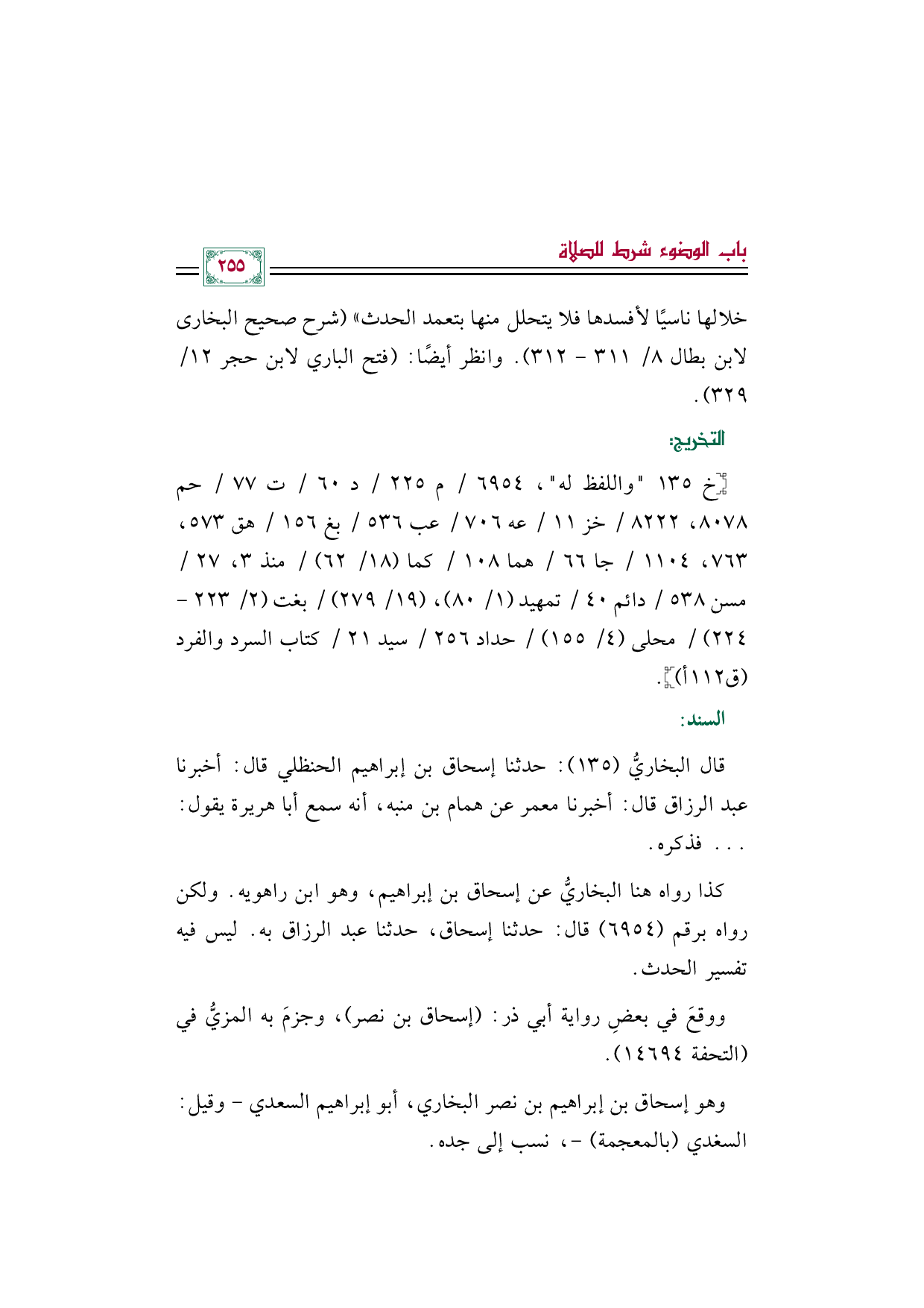 قال البخاريُّ (١٣٥): حدثنا إسحاق بن إبراهيم الحنظلي قال: أخبرنا عبد الرزاق قال: أخبرنا معمر عن همام بن منبه، أنه سمع أبا هريرة يقول: ... فذكره.