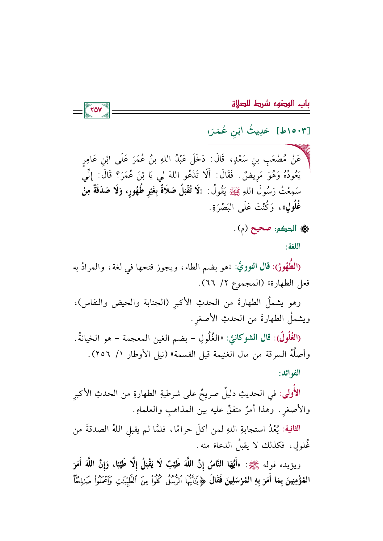 * (الطُّهُورُ): قال النوويُّ: "هو بضم الطاء، ويجوز فتحها في لغة، والمرادُ به فعل الطهارة" (المجموع ٢/ ٦٦).