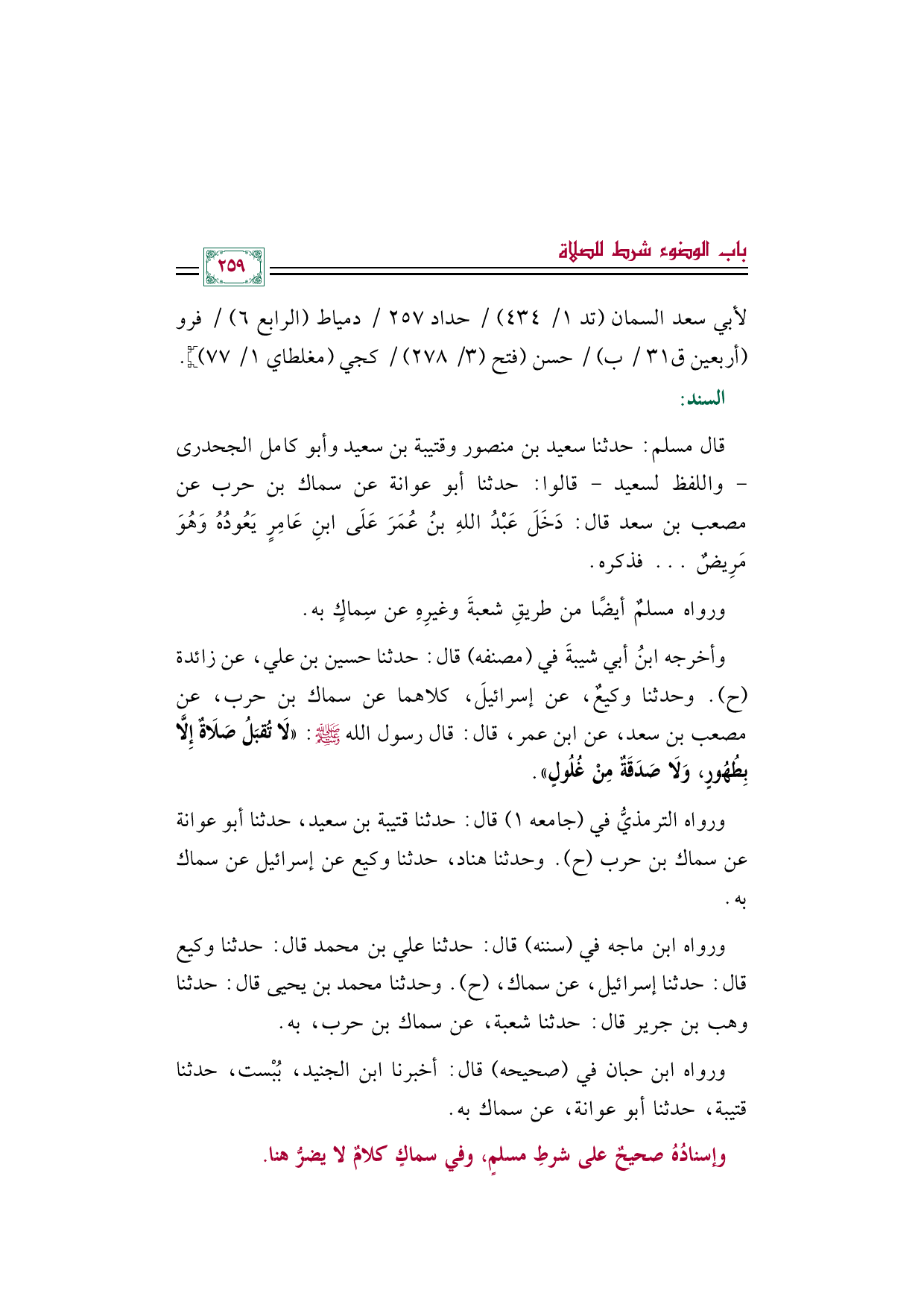 وأخرجه ابنُ أبي شيبةَ في (مصنفه) قال: حدثنا حسين بن علي، عن زائدة (ح). وحدثنا وكيعٌ، عن إسرائيلَ، كلاهما عن سماك بن حرب، عن مصعب بن سعد، عن ابن عمر، قال: قال رسول الله صلى الله عليه وسلم: «لَا تُقبَلُ صَلَاةٌ إِلَّا بِطُهُورٍ، وَلَا صَدَقَةٌ مِنْ غُلُولٍ».