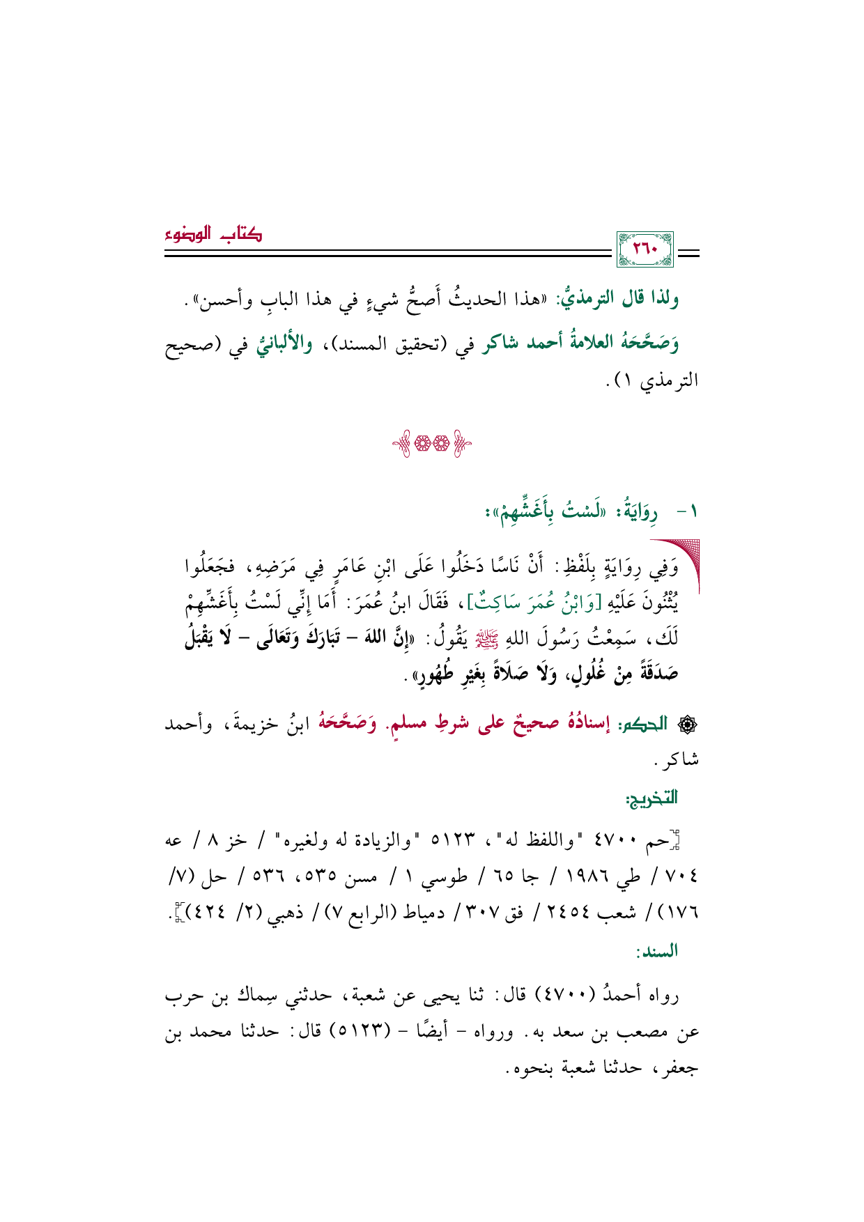 [حم ٤٧٠٠ (واللفظ له)، ٥١٢٣ (والزيادة له ولغيره) / خز ٨/ عه ٧٠٤/ طي ١٩٨٦/ جا ٦٥/ طوسي ١/ مسن ٥٣٥، ٥٣٦/ حل (٧/ ١٧٦) / شعب ٢٤٥٤/ فق ٣٠٧/ دمياط (الرابع ٧) / ذهبي (٢/ ٤٢٤)].