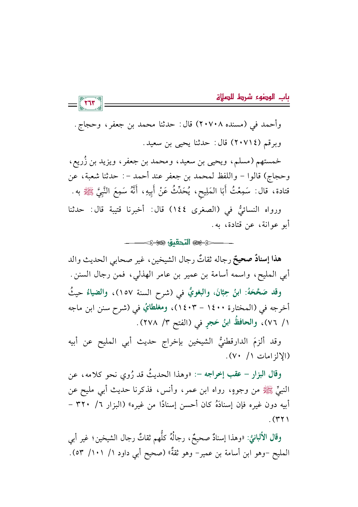 وقال الألبانيُّ: "وهذا إسنادٌ صحيحٌ، رجالُهُ كلُّهم ثقاتٌ رجال الشيخين؛ غير أبي المليح -وهو ابن أسامة بن عمير- وهو ثقةٌ" (صحيح أبي داود ١/ ١٠١/ ٥٣).