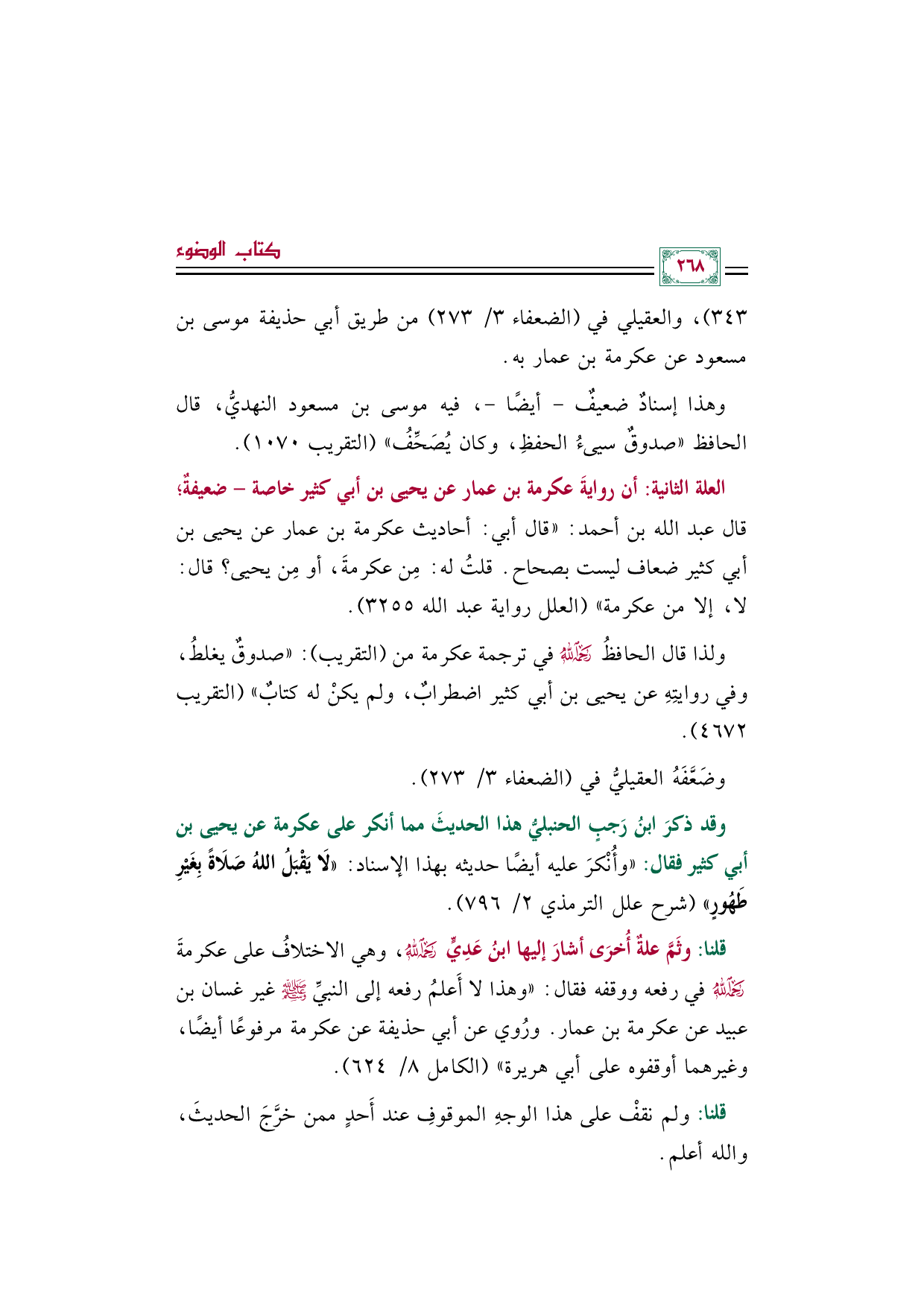 وقد ذكرَ ابنُ رَجبٍ الحنبليُّ هذا الحديثَ مما أنكر على عكرمة عن يحيى بن أبي كثير فقال: "وأُنْكرَ عليه أيضًا حديثه بهذا الإسناد: «لَا يَقْبَلُ اللهُ صَلَاةً بِغَيْرِ طَهُورٍ» (شرح علل الترمذي ٢/ ٧٩٦).