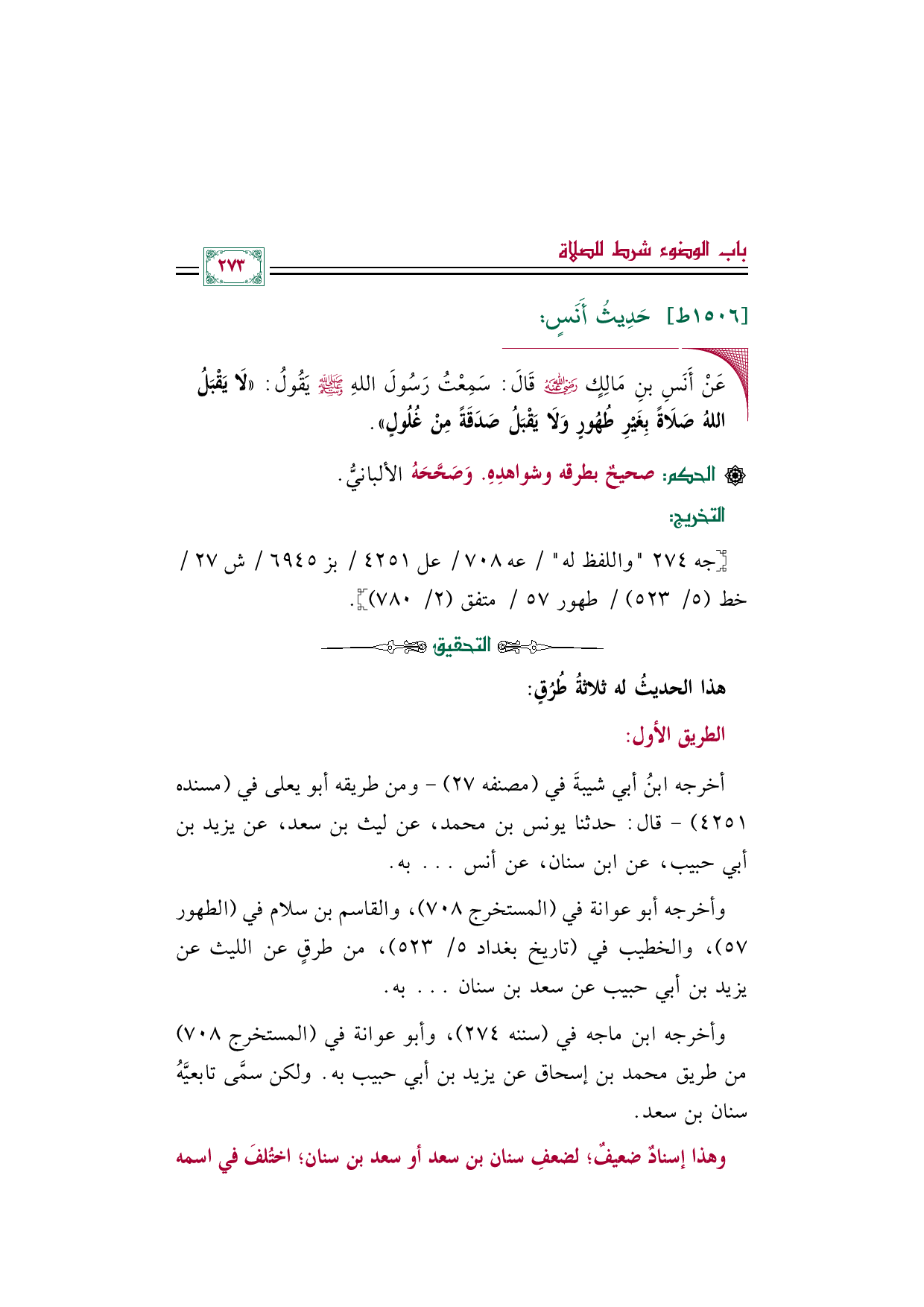 وأخرجه ابن ماجه في (سننه ٢٧٤)، وأبو عوانة في (المستخرج ٧٠٨) من طريق محمد بن إسحاق عن يزيد بن أبي حبيب به. ولكن سمَّى تابعيَّهُ سنان بن سعد.