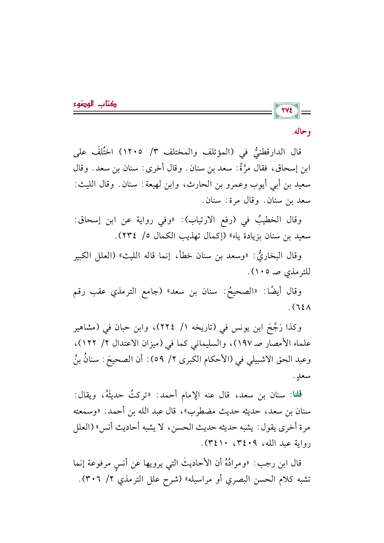 وكذا رَجَّحَ ابن يونس في (تاريخه ١/ ٢٢٤)، وابن حبان في (مشاهير علماء الأمصار صـ ١٩٧)، والسليماني كما في (ميزان الاعتدال ٢/ ١٢٢)، وعبد الحق الاشبيلي في (الأحكام الكبرى ٢/ ٥٩): أن الصحيحَ: سنانُ بنُ سعدٍ.