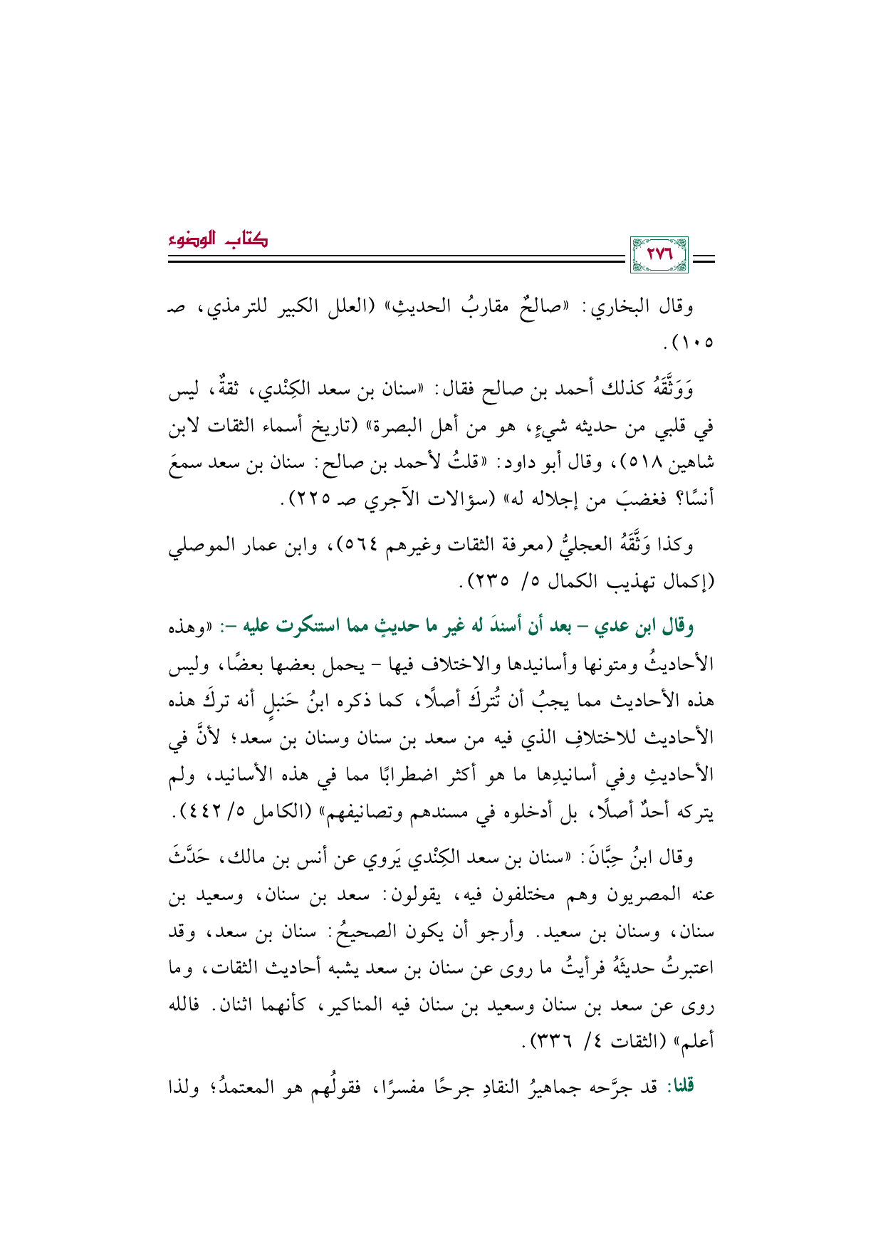 وقال ابن عدي -بعد أن أسندَ له غير ما حديثٍ مما استنكرت عليه-: "وهذه الأحاديثُ ومتونها وأسانيدها والاختلاف فيها- يحمل بعضها بعضًا، وليس هذه الأحاديث مما يجبُ أن تُتركَ أصلًا، كما ذكره ابنُ حَنبلٍ أنه تركَ هذه الأحاديث للاختلافِ الذي فيه من سعد بن سنان وسنان بن سعد؛ لأنَّ في الأحاديثِ وفي أسانيدِها ما هو أكثر اضطرابًا مما في هذه الأسانيد، ولم يتركه أحدٌ أصلًا، بل أدخلوه في مسندهم وتصانيفهم" (الكامل ٥/ ٤٤٢).