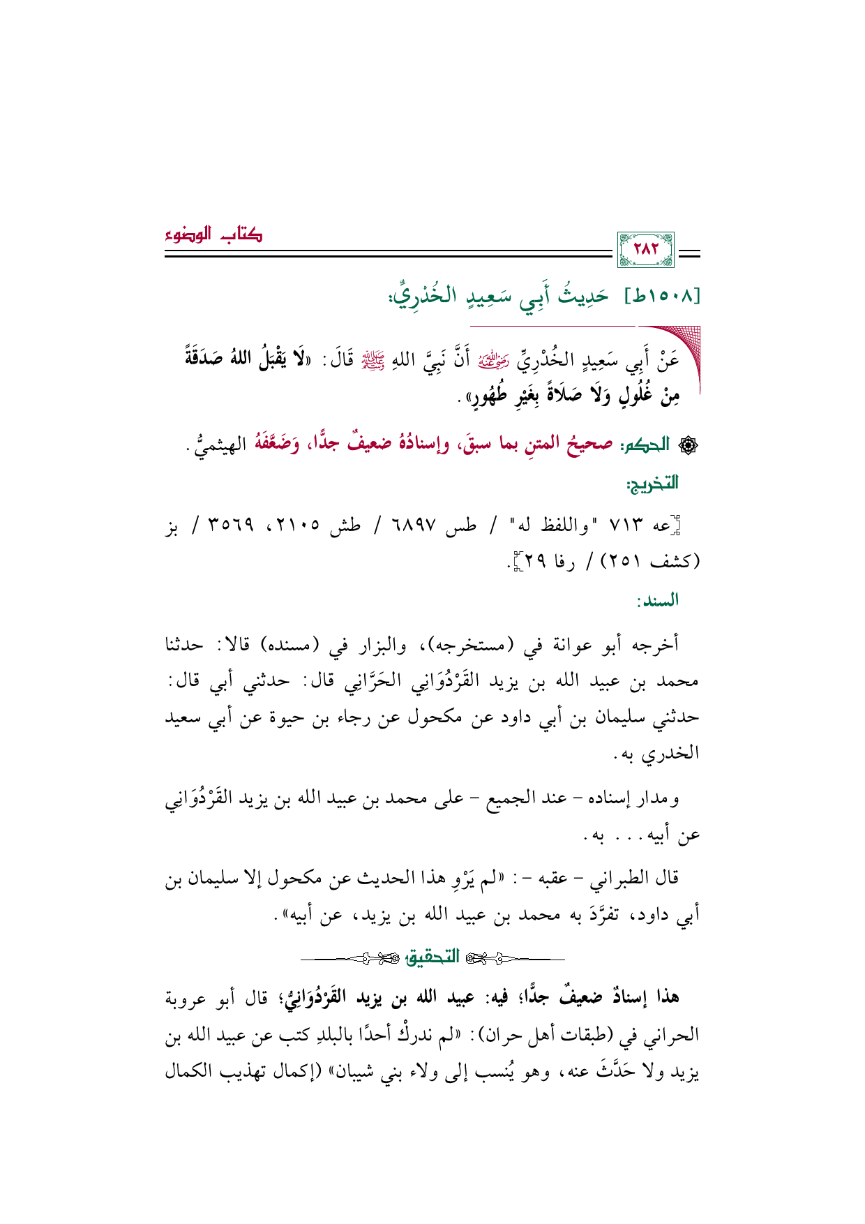 أخرجه أبو عوانة في (مستخرجه)، والبزار في (مسنده) قالا: حدثنا محمد بن عبيد الله بن يزيد القَرْدُوَانِي الحَرَّانِي قال: حدثني أبي قال: حدثني سليمان بن أبي داود عن مكحول عن رجاء بن حيوة عن أبي سعيد الخدري به.