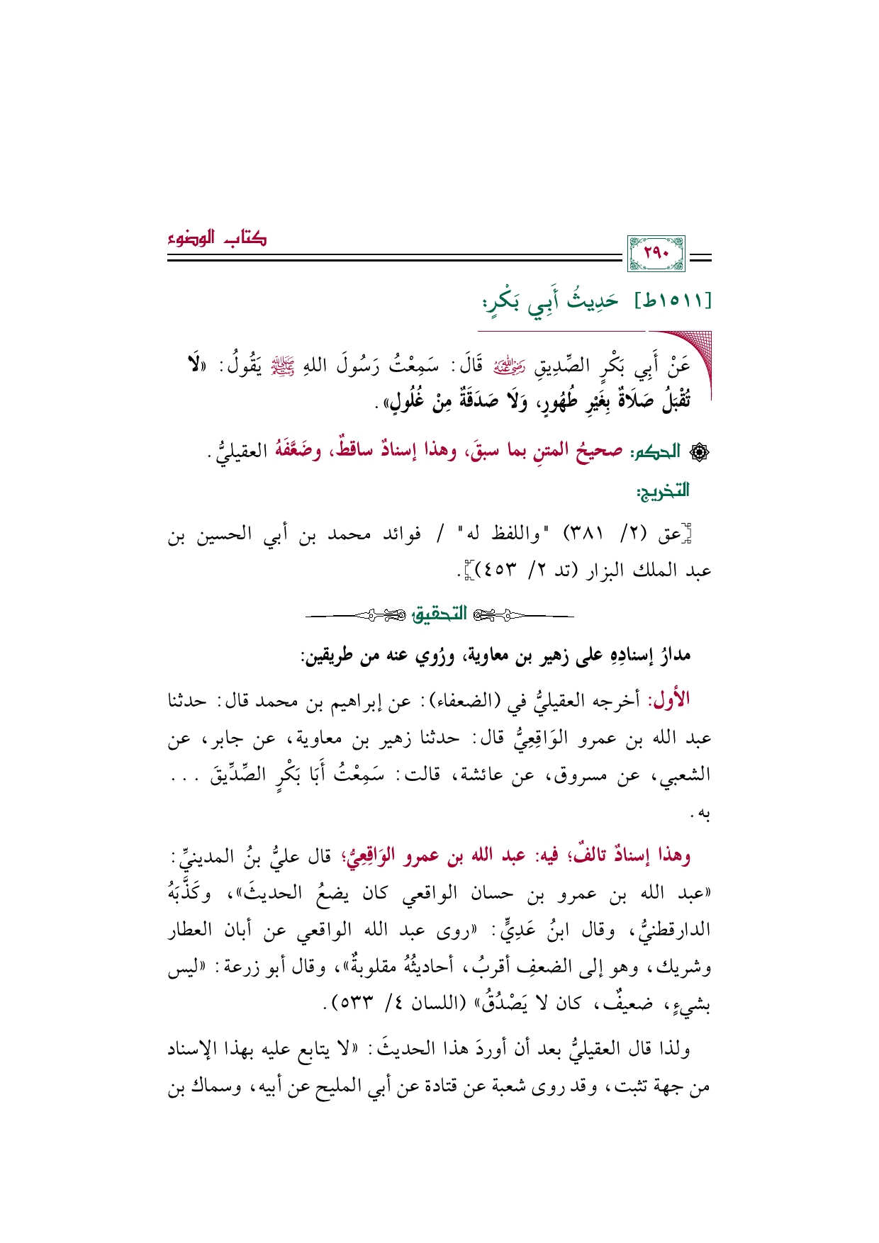 ◼ عَنْ أَبِي بَكْرٍ الصِّدِيقِ رضي الله عنه قَالَ: سَمِعْتُ رَسُولَ اللهِ صلى الله عليه وسلم يَقُولُ: «لَا تُقْبَلُ صَلَاةٌ بِغَيْرِ طُهُورٍ، وَلَا صَدَقَةٌ مِنْ غُلُولٍ».