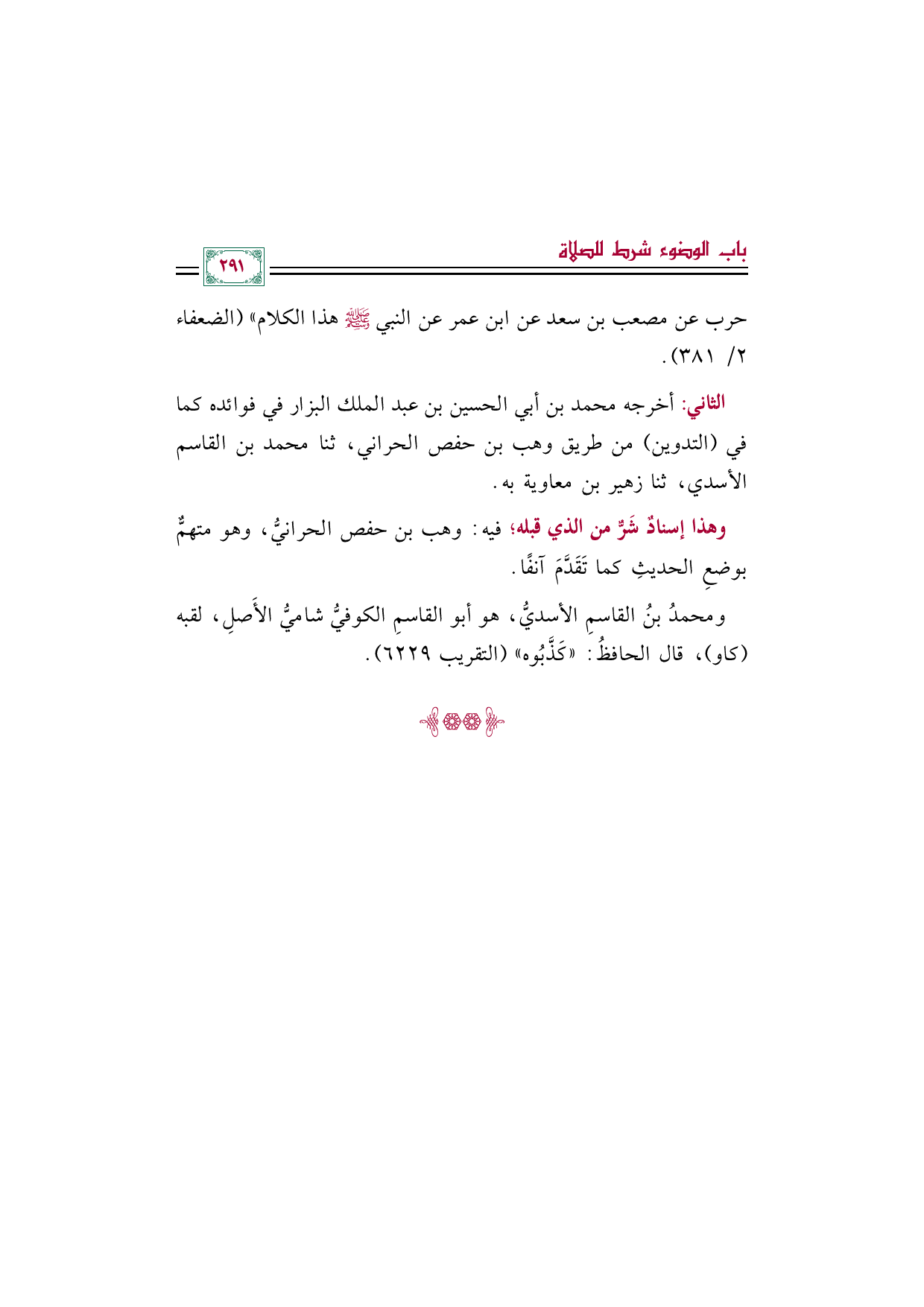 ومحمدُ بنُ القاسمِ الأسديُّ، هو أبو القاسمِ الكوفيُّ شاميُّ الأَصلِ، لقبه (كاو)، قال الحافظُ: "كَذَّبُوه" (التقريب ٦٢٢٩).