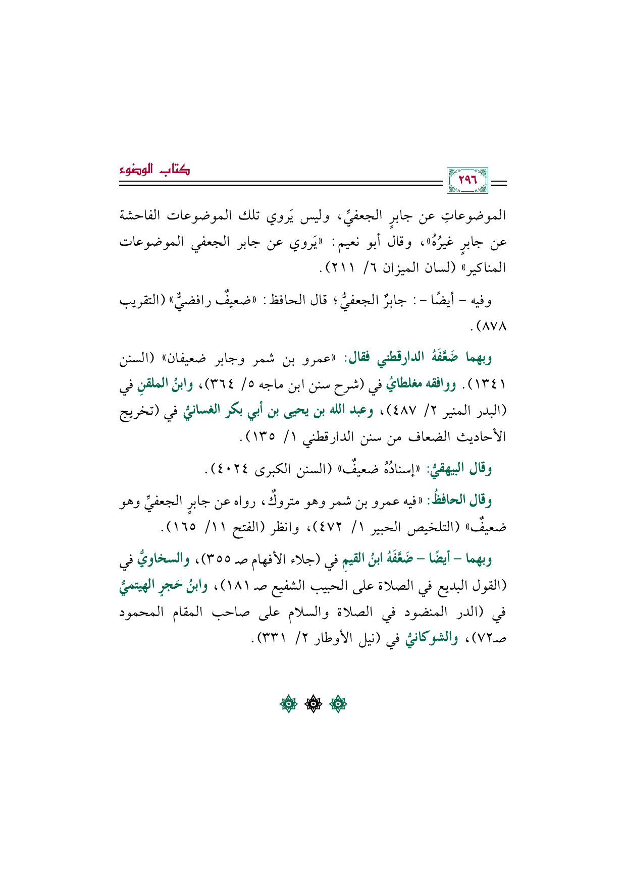 وبهما ضَعَّفَهُ الدارقطني فقال: "عمرو بن شمر وجابر ضعيفان" (السنن ١٣٤١). ووافقه مغلطايُ في (شرح سنن ابن ماجه ٥/ ٣٦٤)، وابنُ الملقنِ في (البدر المنير ٢/ ٤٨٧)، وعبد الله بن يحيى بن أبي بكر الغسانيُّ في (تخريج الأحاديث الضعاف من سنن الدارقطني ١/ ١٣٥).