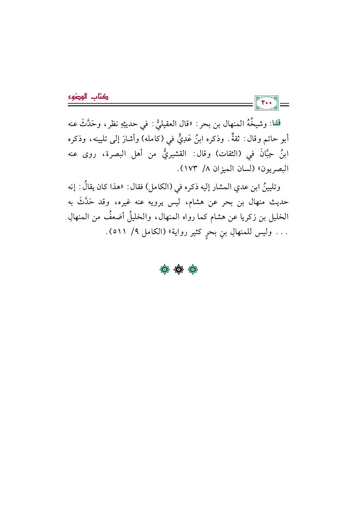 وتليينُ ابن عدي المشار إليه ذكره في (الكامل) فقال: "هذا كان يقالُ: إنه حديث منهال بن بحر عن هشام، ليس يرويه عنه غيره، وقد حَدَّثَ به الخليل بن زكريا عن هشام كما رواه المنهال، والخليلُ أضعفُ من المنهالِ ... وليس للمنهالِ بنِ بحرٍ كثير رواية" (الكامل ٩/ ٥١١).