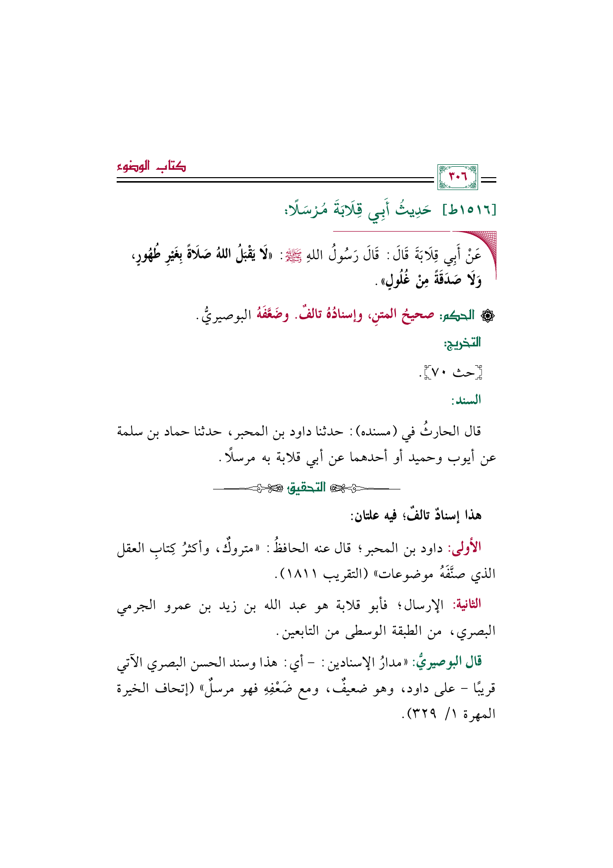 قال الحارثُ في (مسنده): حدثنا داود بن المحبر، حدثنا حماد بن سلمة عن أيوب وحميد أو أحدهما عن أبي قلابة به مرسلًا.