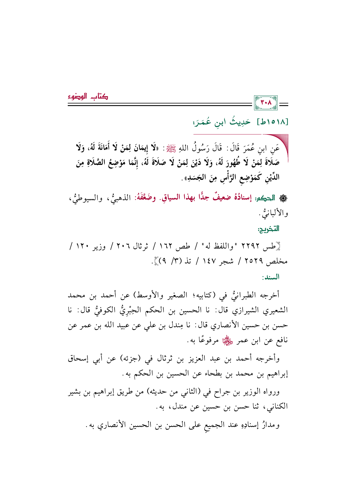 أخرجه الطبرانيُّ في (كتابيه؛ الصغير والأوسط) عن أحمد بن محمد الشعيري الشيرازي قال: نا الحسين بن الحكم الحِبْرِيُّ الكوفيُّ قال: نا حسن بن حسين الأنصاري قال: نا مِندل بن علي عن عبيد الله بن عمر عن نافع عن ابن عمر رضي الله عنهما مرفوعًا به.