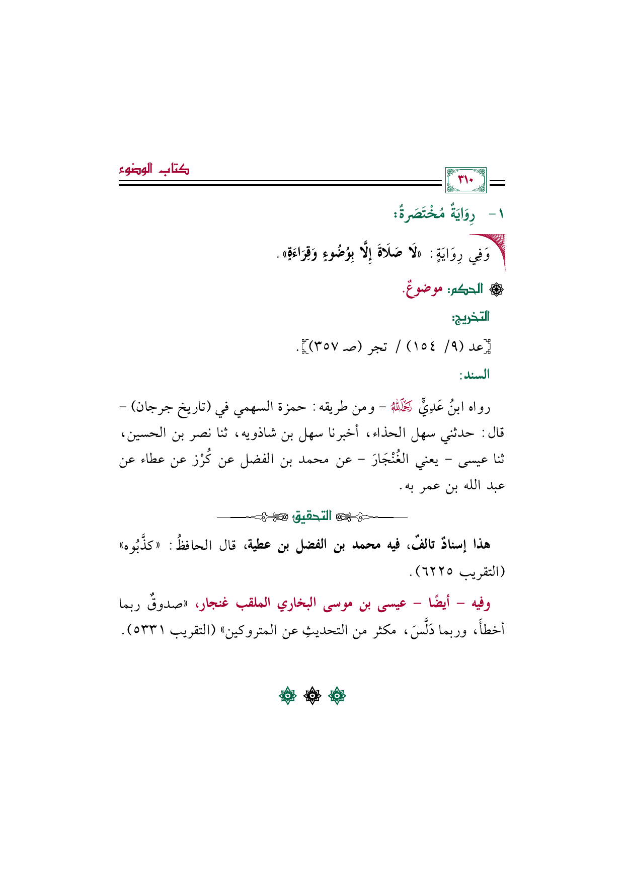رواه ابنُ عَدِيٍّ رحمه الله -ومن طريقه: حمزة السهمي في (تاريخ جرجان) - قال: حدثني سهل الحذاء، أخبرنا سهل بن شاذويه، ثنا نصر بن الحسين، ثنا عيسى -يعني الغُنْجَارَ- عن محمد بن الفضل عن كُرْز عن عطاء عن عبد الله بن عمر به.