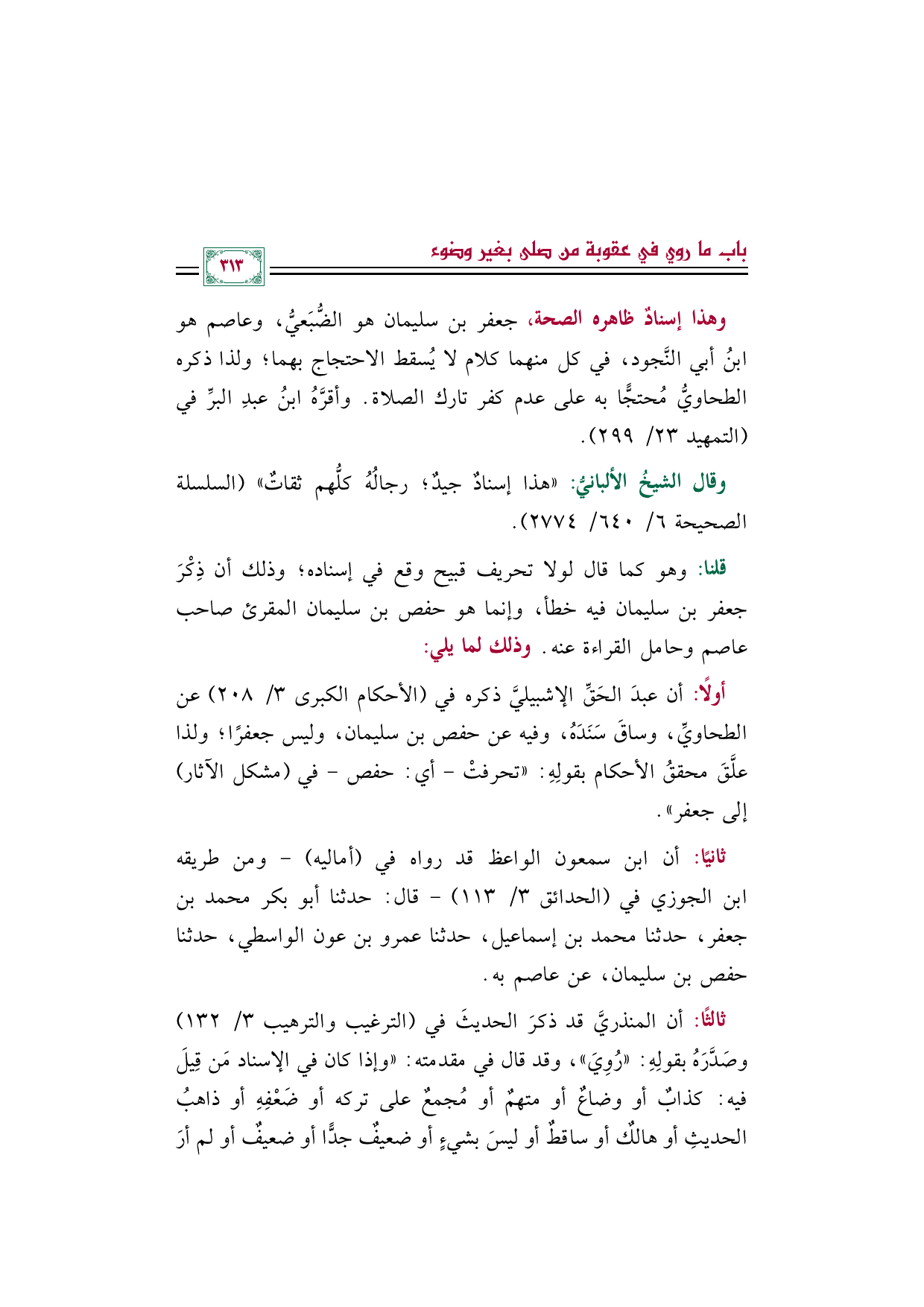 وهذا إسنادٌ ظاهره الصحة، جعفر بن سليمان هو الضُّبَعيُّ، وعاصم هو ابنُ أبي النَّجود، في كل منهما كلام لا يُسقط الاحتجاج بهما؛ ولذا ذكره الطحاويُّ مُحتجًّا به على عدم كفر تارك الصلاة. وأقرَّهُ ابنُ عبدِ البرِّ في (التمهيد ٢٣/ ٢٩٩).