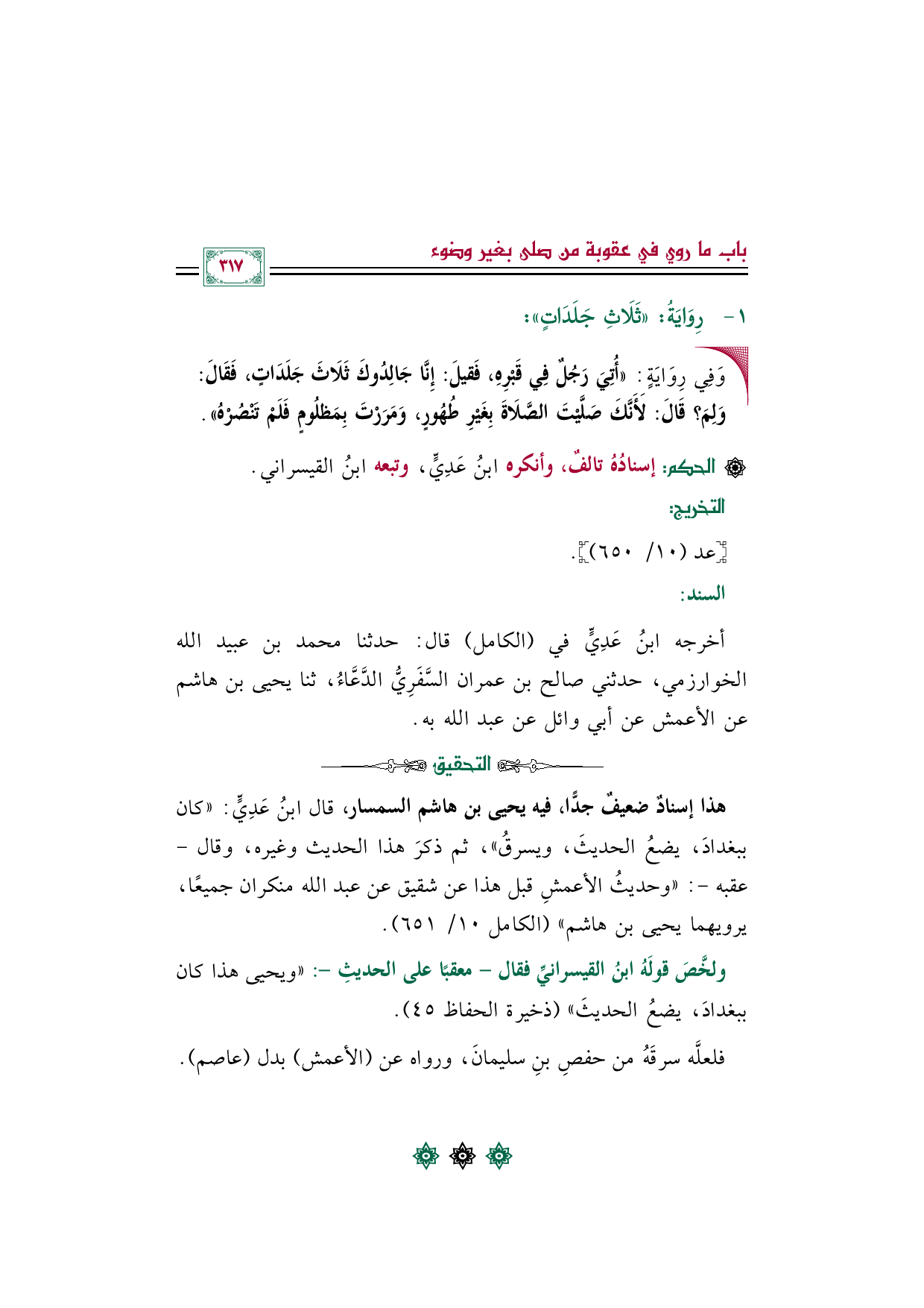 أخرجه ابنُ عَدِيٍّ في (الكامل) قال: حدثنا محمد بن عبيد الله الخوارزمي، حدثني صالح بن عمران السَّفَرِيُّ الدَّعَّاءُ، ثنا يحيى بن هاشم عن الأعمش عن أبي وائل عن عبد الله به.