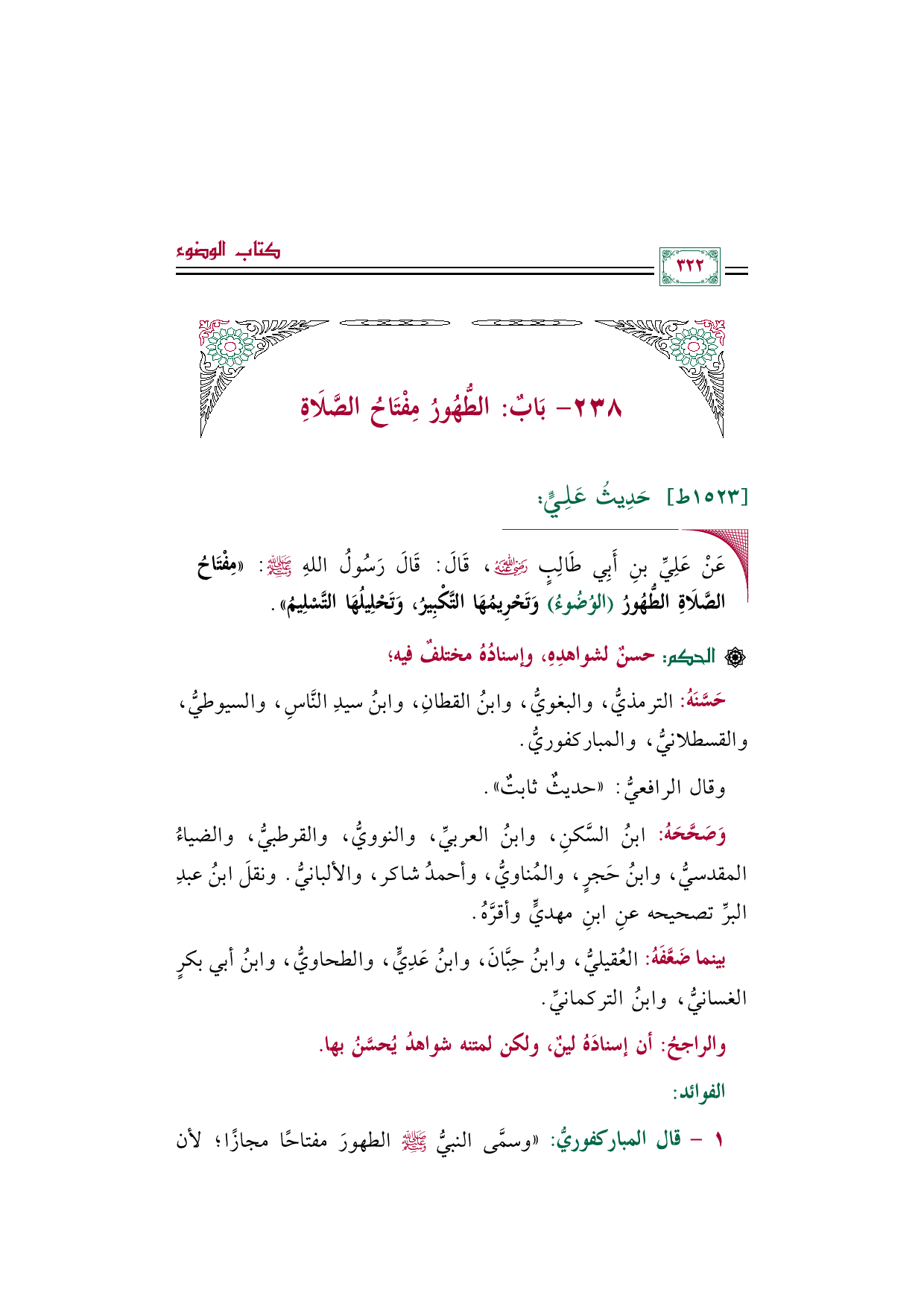 ◼ عَنْ عَلِيِّ بنِ أَبِي طَالِبٍ رضي الله عنه، قَالَ: قَالَ رَسُولُ اللهِ صلى الله عليه وسلم: «مِفْتَاحُ الصَّلَاةِ الطُّهُورُ (الوُضُوءُ) وَتَحْرِيمُهَا التَّكْبِيرُ، وَتَحْلِيلُهَا التَّسْلِيمُ».