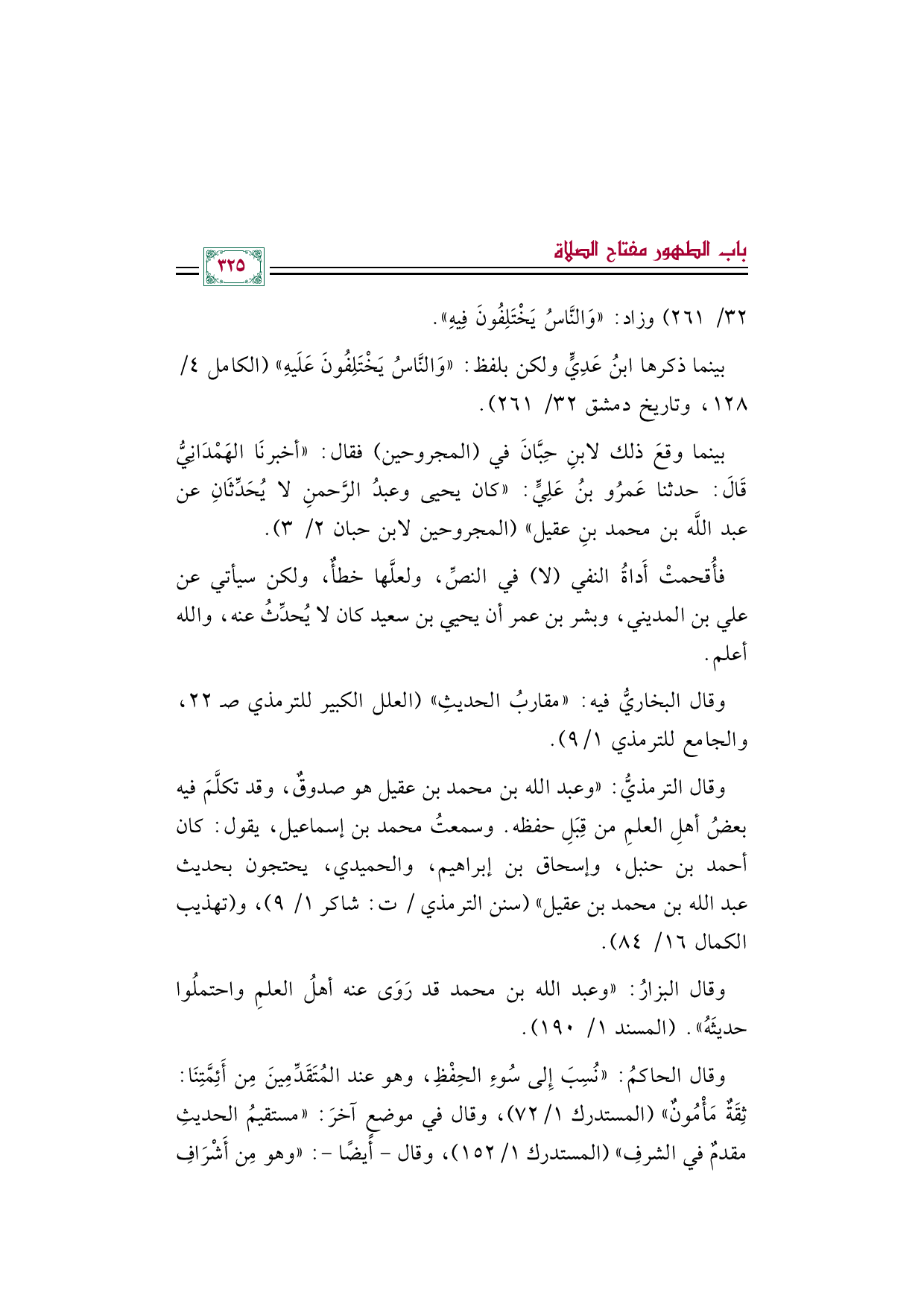 وقال الترمذيُّ: ((وعبد الله بن محمد بن عقيل هو صدوقٌ، وقد تكلَّمَ فيه بعضُ أهلِ العلمِ من قِبَلِ حفظه. وسمعتُ محمد بن إسماعيل، يقول: كان أحمد بن حنبل، وإسحاق بن إبراهيم، والحميدي، يحتجون بحديث عبد الله بن محمد بن عقيل)) (سنن الترمذي/ ت: شاكر ١/ ٩)، و (تهذيب الكمال ١٦/ ٨٤).