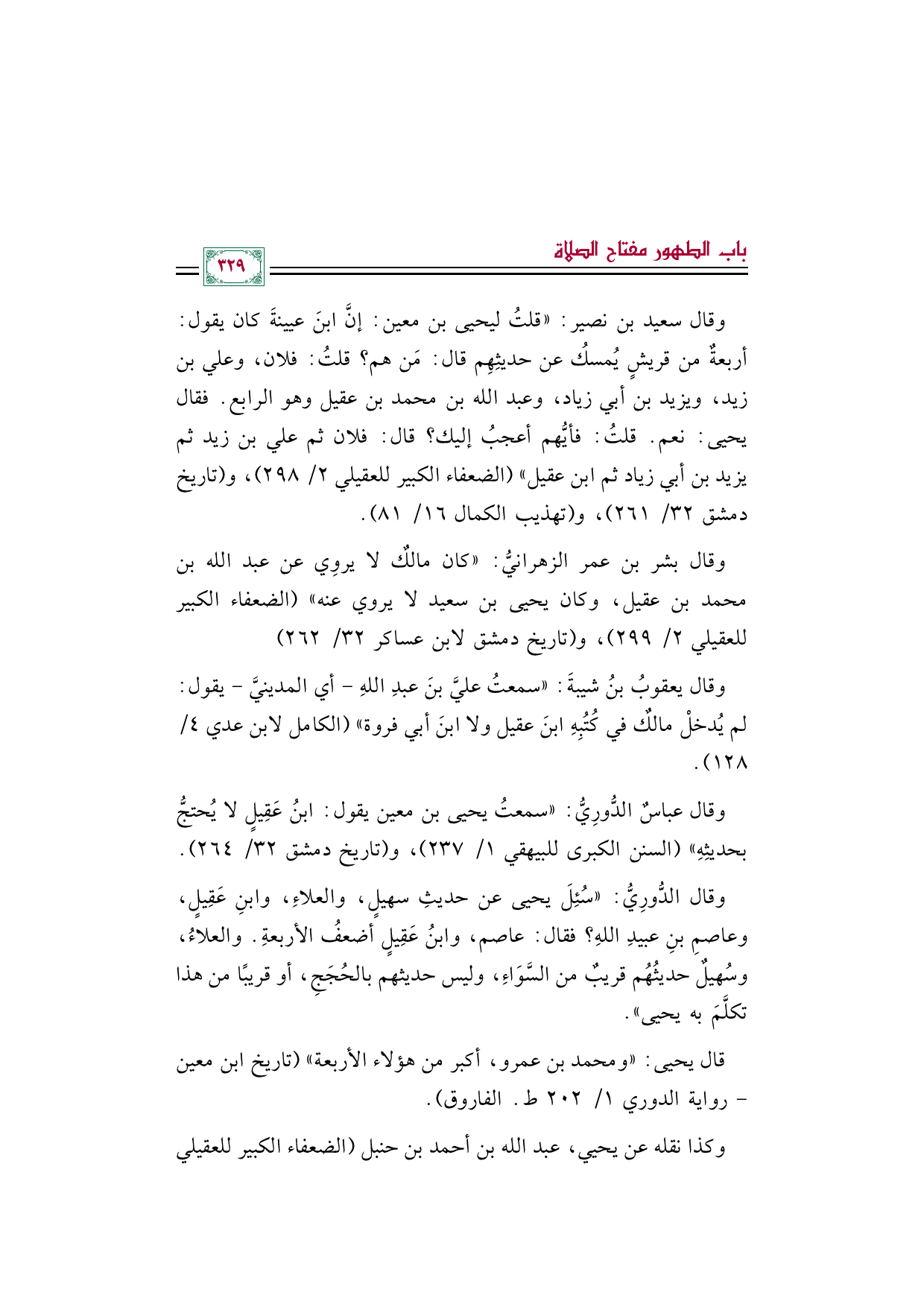 وقال بشر بن عمر الزهرانيُّ: ((كان مالكٌ لا يروِي عن عبد الله بن محمد بن عقيل، وكان يحيى بن سعيد لا يروي عنه)) (الضعفاء الكبير للعقيلي ٢/ ٢٩٩)، و (تاريخ دمشق لابن عساكر ٣٢/ ٢٦٢)