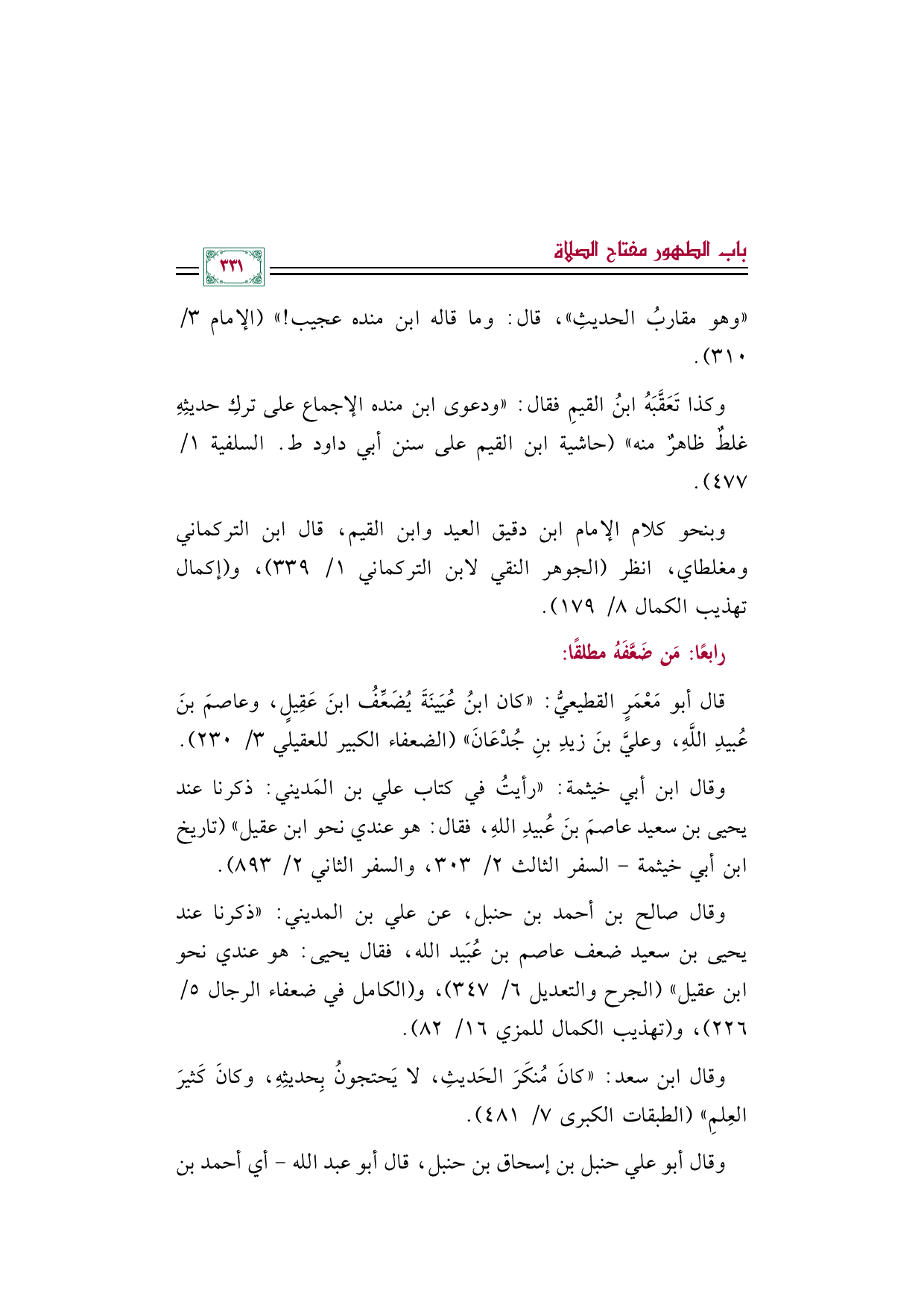 وبنحو كلام الإمام ابن دقيق العيد وابن القيم، قال ابن التركماني ومغلطاي، انظر (الجوهر النقي لابن التركماني ١/ ٣٣٩)، و (إكمال تهذيب الكمال ٨/ ١٧٩).
