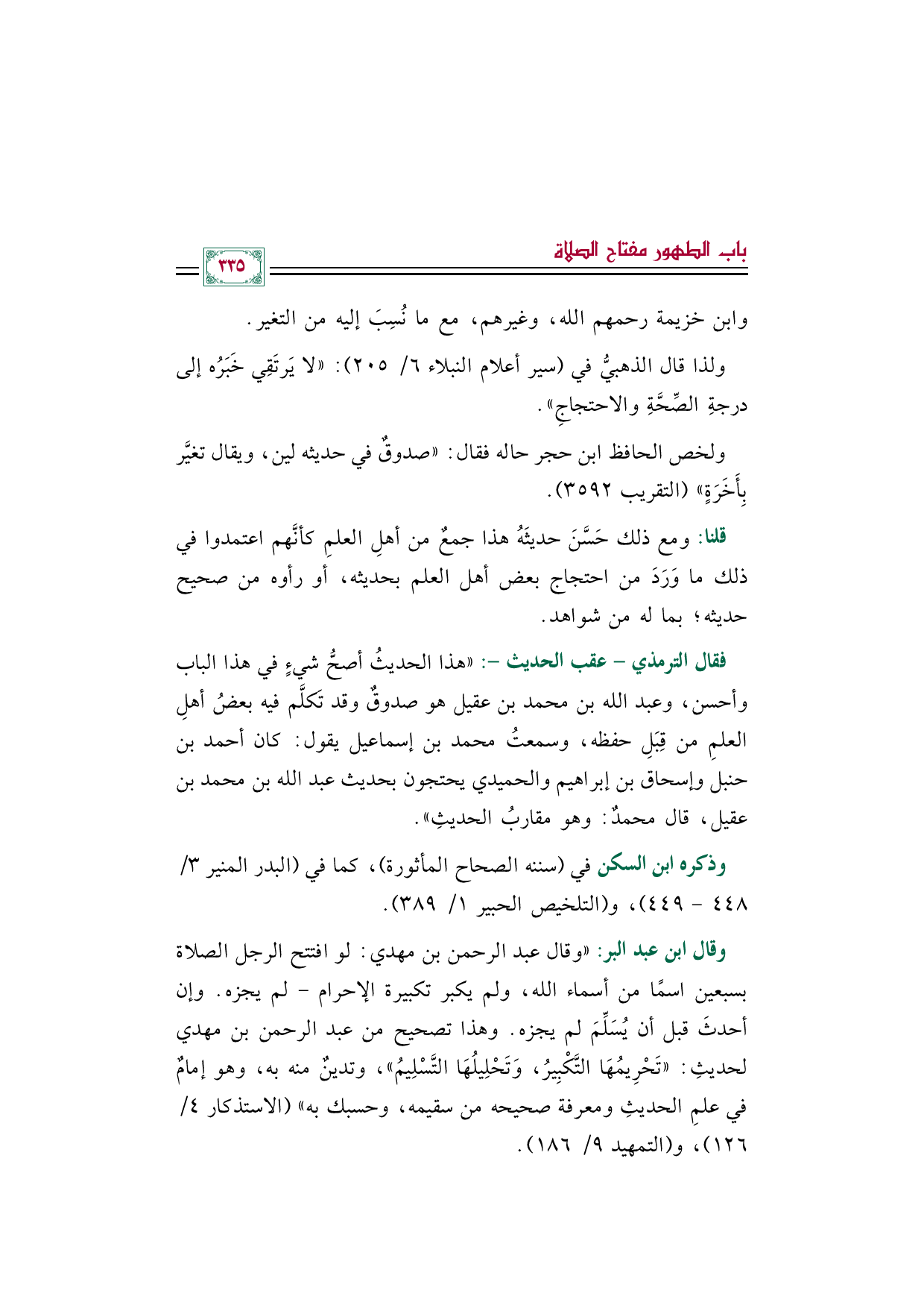وقال ابن عبد البر: ((وقال عبد الرحمن بن مهدي: لو افتتح الرجل الصلاة بسبعين اسمًا من أسماء الله، ولم يكبر تكبيرة الإحرام- لم يجزه. وإن أحدثَ قبل أن يُسَلِّمَ لم يجزه. وهذا تصحيح من عبد الرحمن بن مهدي لحديثِ: «تَحْرِيمُهَا التَّكْبِيرُ، وَتَحْلِيلُهَا التَّسْلِيمُ»، وتدينٌ منه به، وهو إمامٌ في علمِ الحديثِ ومعرفة صحيحه من سقيمه، وحسبك به)) (الاستذكار ٤/ ١٢٦)، و (التمهيد ٩/ ١٨٦).