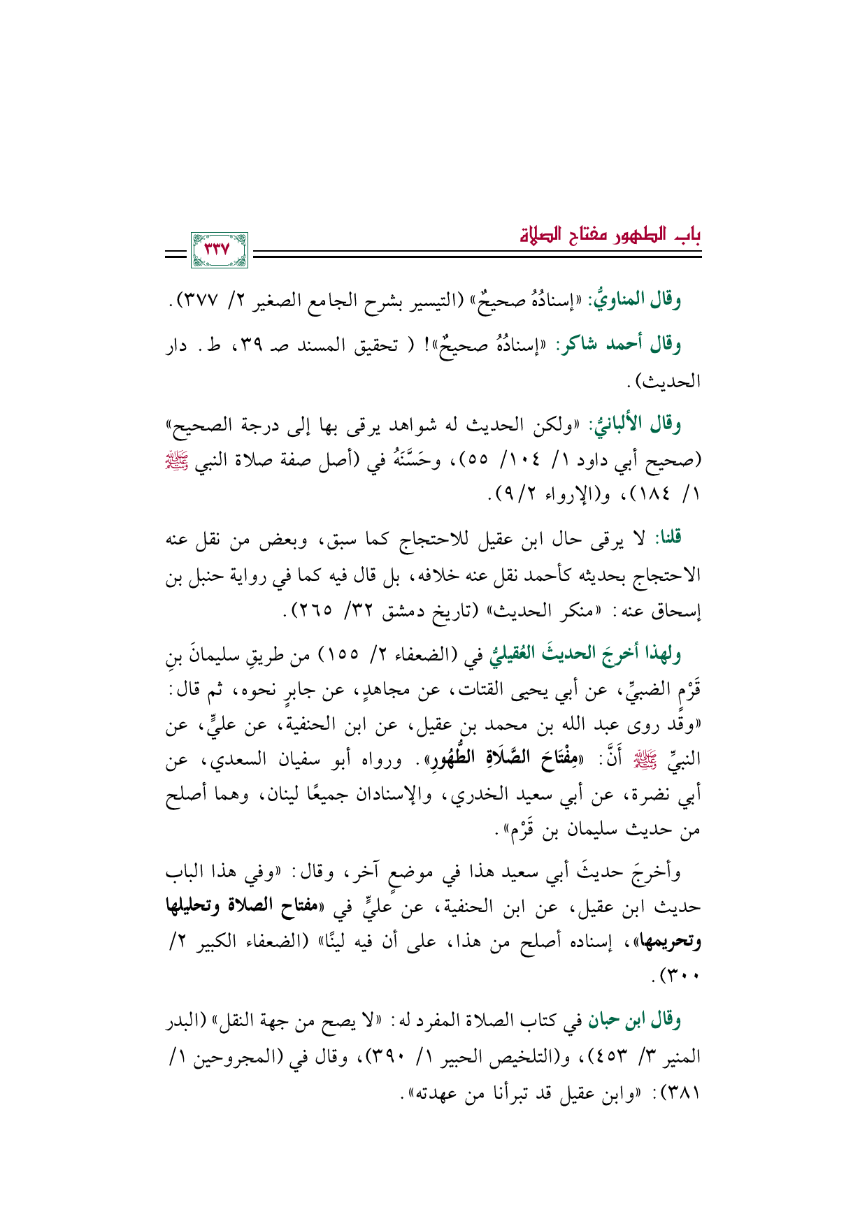 وأخرجَ حديثَ أبي سعيد هذا في موضعٍ آخر، وقال: "وفي هذا الباب حديث ابن عقيل، عن ابن الحنفية، عن عليٍّ في ((مفتاح الصلاة وتحليلها وتحريمها))، إسناده أصلح من هذا، على أن فيه لينًا" (الضعفاء الكبير ٢/ ٣٠٠).
