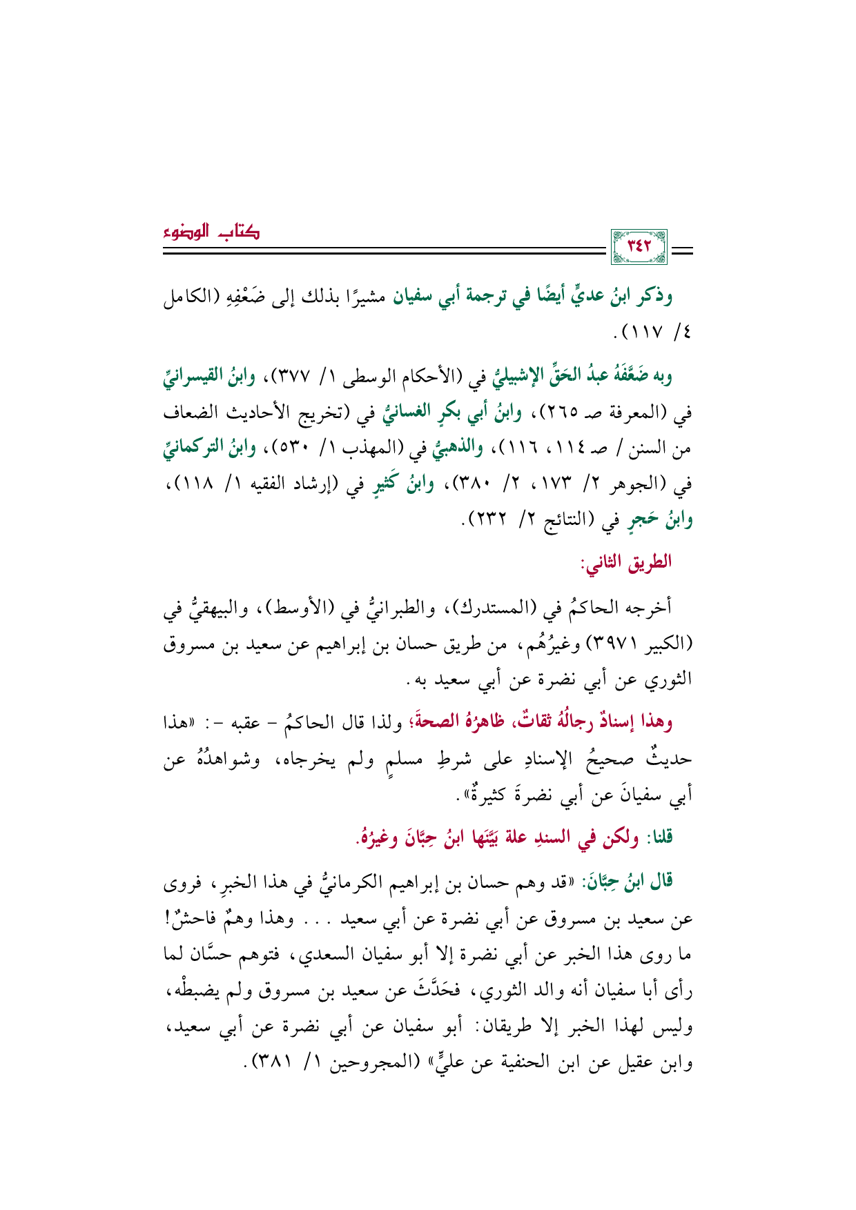 قال ابنُ حِبَّانَ: "قد وهم حسان بن إبراهيم الكرمانيُّ في هذا الخبرِ، فروى عن سعيد بن مسروق عن أبي نضرة عن أبي سعيد ... وهذا وهمٌ فاحشٌ! ما روى هذا الخبر عن أبي نضرة إلا أبو سفيان السعدي، فتوهم حسَّان لما رأى أبا سفيان أنه والد الثوري، فحَدَّثَ عن سعيد بن مسروق ولم يضبطْه، وليس لهذا الخبر إلا طريقان: أبو سفيان عن أبي نضرة عن أبي سعيد، وابن عقيل عن ابن الحنفية عن عليٍّ" (المجروحين ١/ ٣٨١).