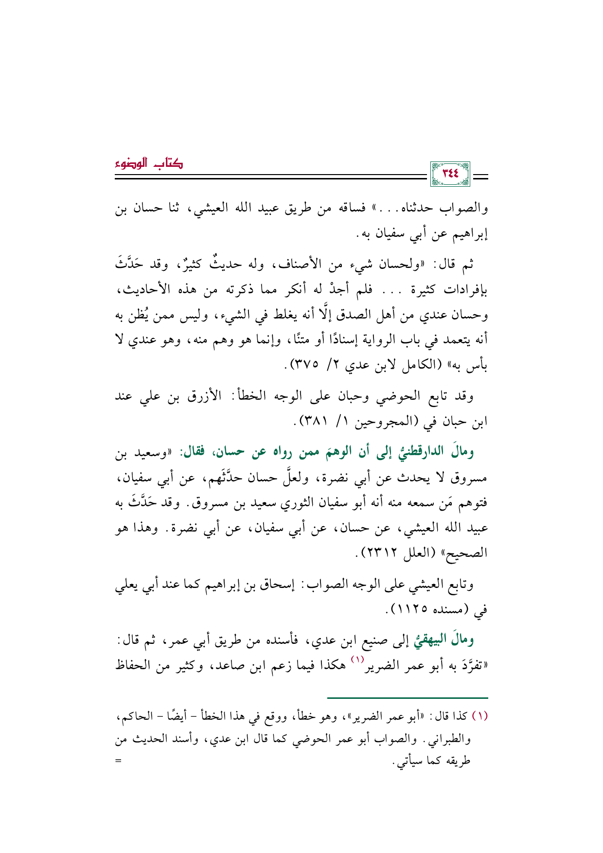 (¬١) كذا قال: "أبو عمر الضرير"، وهو خطأ، ووقع في هذا الخطأ -أيضًا- الحاكم، والطبراني. والصواب أبو عمر الحوضي كما قال ابن عدي، وأسند الحديث من طريقه كما سيأتي.