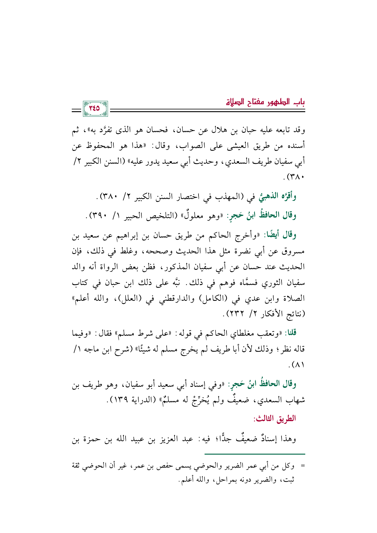 وقال الحافظُ ابنُ حَجرٍ: "وفي إسناد أبي سعيد أبو سفيان، وهو طريف بن شهاب السعدي، ضعيفٌ ولم يُخرِّجْ له مسلمٌ" (الدراية ١٣٩).