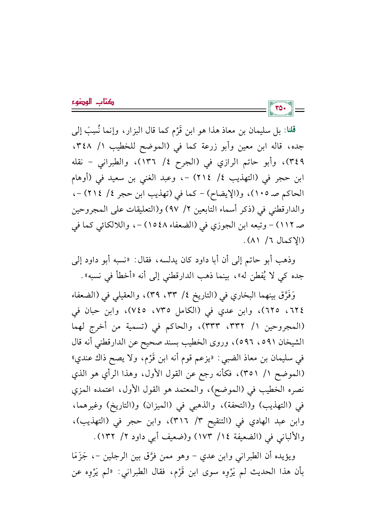 وَفَرَّق بينهما البخاري في (التاريخ ٤/ ٣٣، ٣٩)، والعقيلي في (الضعفاء ٦٢٤، ٦٢٥)، وابن عدي في (الكامل ٧٣٥، ٧٤٥)، وابن حبان في (المجروحين ١/ ٣٣٢، ٣٣٣)، والحاكم في (تسمية من أخرج لهما الشيخان ٥٩١، ٥٩٦)، وروى الخطيب بسند صحيح عن الدارقطني أنه قال في سليمان بن معاذ الضبي: "يزعم قوم أنه ابن قَرْم، ولا يصح ذاك عندي" (الموضح ١/ ٣٥١)، فكأنه رجع عن القول الأول، وهذا الرأي هو الذي نصره الخطيب في (الموضح)، والمعتمد هو القول الأول، اعتمده المزي في (التهذيب) و (التحفة)، والذهبي في (الميزان) و (التاريخ) وغيرهما، وابن عبد الهادي في (التنقيح ٣/ ٣١٦)، وابن حجر في (التهذيب)، والألباني في (الضعيفة ١٤/ ١٧٣) و (ضعيف أبي داود ٢/ ١٣٢).