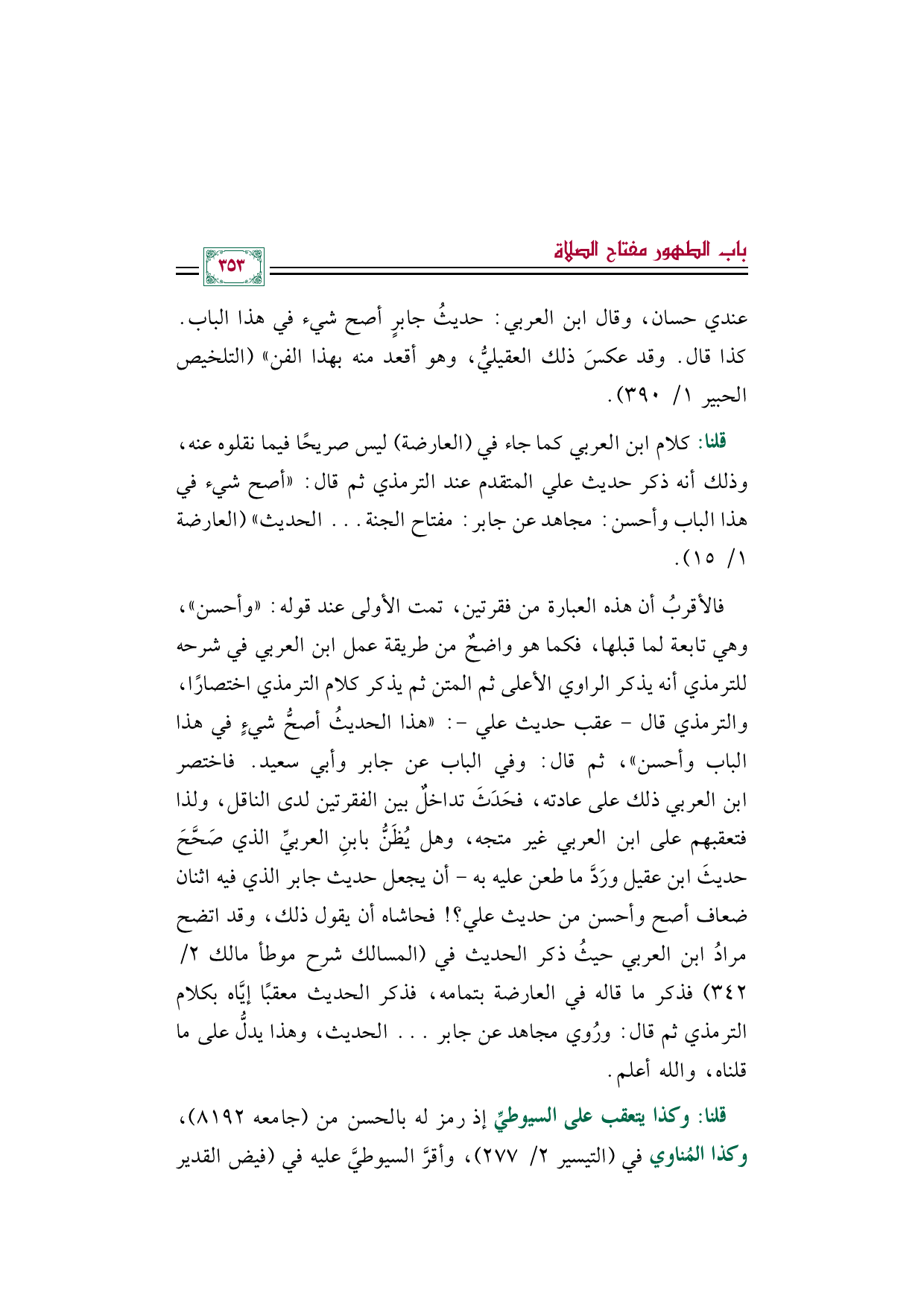 فالأقربُ أن هذه العبارة من فقرتين، تمت الأولى عند قوله: "وأحسن"، وهي تابعة لما قبلها، فكما هو واضحٌ من طريقة عمل ابن العربي في شرحه للترمذي أنه يذكر الراوي الأعلى ثم المتن ثم يذكر كلام الترمذي اختصارًا، والترمذي قال -عقب حديث علي-: "هذا الحديثُ أصحُّ شيءٍ في هذا الباب وأحسن"، ثم قال: وفي الباب عن جابر وأبي سعيد. فاختصر ابن العربي ذلك على عادته، فحَدَثَ تداخلٌ بين الفقرتين لدى الناقل، ولذا فتعقبهم على ابن العربي غير متجه، وهل يُظَنُّ بابنِ العربيِّ الذي صَحَّحَ حديثَ ابن عقيل ورَدَّ ما طعن عليه به- أن يجعل حديث جابر الذي فيه اثنان ضعاف أصح وأحسن من حديث علي؟ ! فحاشاه أن يقول ذلك، وقد اتضح مرادُ ابن العربي حيثُ ذكر الحديث في (المسالك شرح موطأ مالك ٢/ ٣٤٢) فذكر ما قاله في العارضة بتمامه، فذكر الحديث معقبًا إيَّاه بكلام الترمذي ثم قال: ورُوي مجاهد عن جابر ... الحديث، وهذا يدلُّ على ما قلناه، والله أعلم.