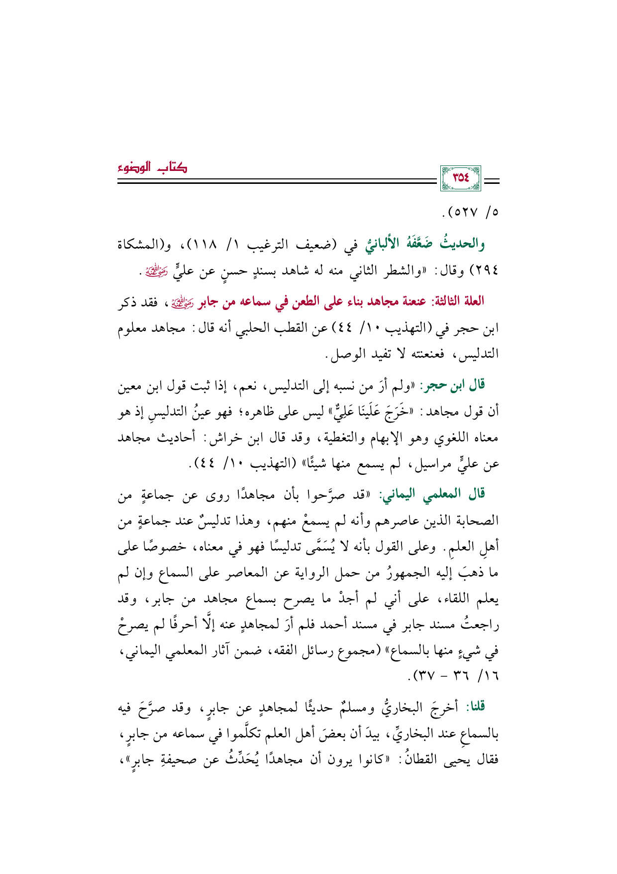 قال المعلمي اليماني: "قد صرَّحوا بأن مجاهدًا روى عن جماعةٍ من الصحابة الذين عاصرهم وأنه لم يسمعْ منهم، وهذا تدليسٌ عند جماعةٍ من أهلِ العلمِ. وعلى القول بأنه لا يُسَمَّى تدليسًا فهو في معناه، خصوصًا على ما ذهبَ إليه الجمهورُ من حمل الرواية عن المعاصر على السماع وإن لم يعلم اللقاء، على أني لم أجدْ ما يصرح بسماع مجاهد من جابر، وقد راجعتُ مسند جابر في مسند أحمد فلم أرَ لمجاهدٍ عنه إلَّا أحرفًا لم يصرحْ في شيءٍ منها بالسماع" (مجموع رسائل الفقه، ضمن آثار المعلمي اليماني، ١٦/ ٣٦ - ٣٧).