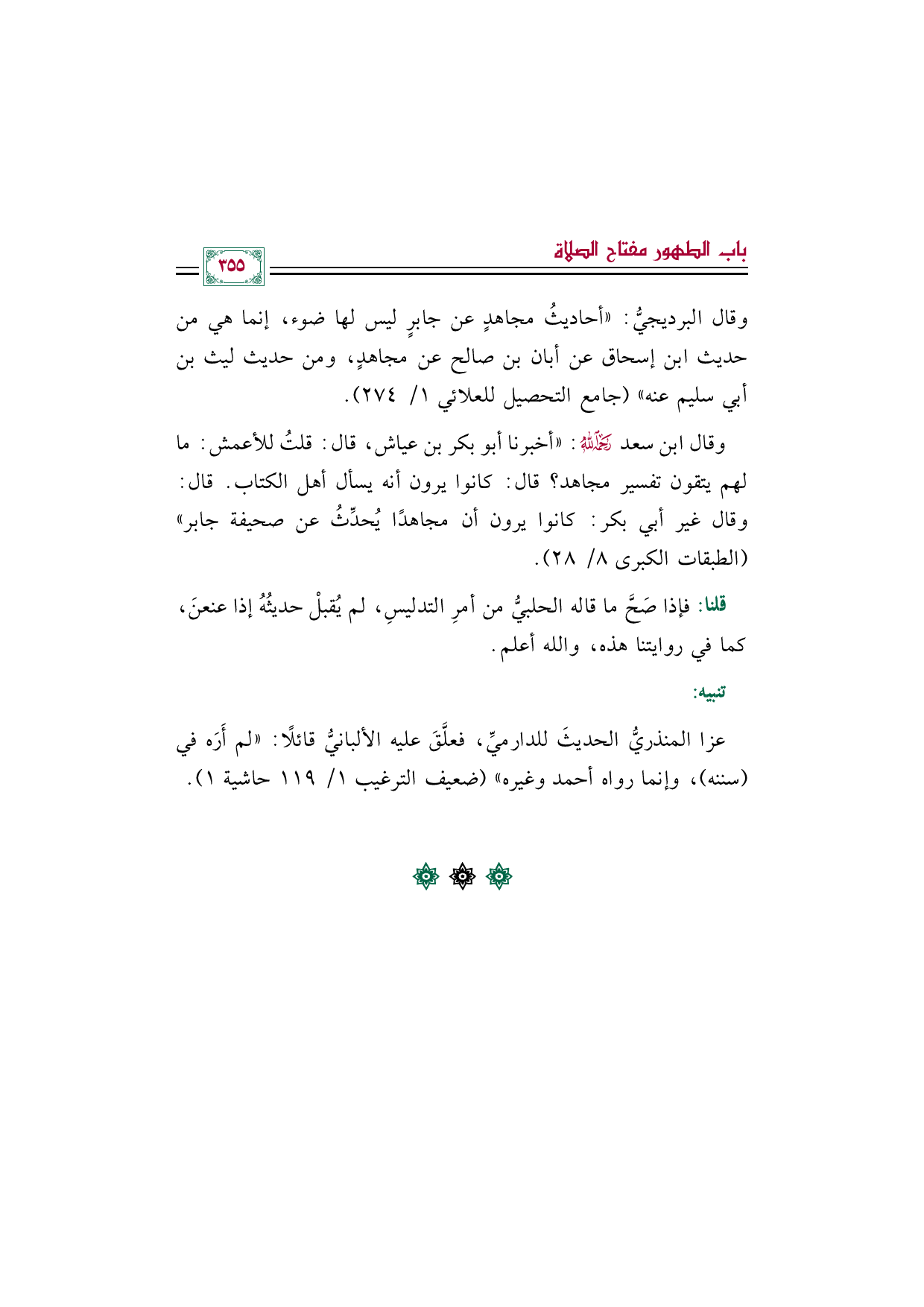 وقال البرديجيُّ: "أحاديثُ مجاهدٍ عن جابرٍ ليس لها ضوء، إنما هي من حديث ابن إسحاق عن أبان بن صالح عن مجاهدٍ، ومن حديث ليث بن أبي سليم عنه" (جامع التحصيل للعلائي ١/ ٢٧٤).