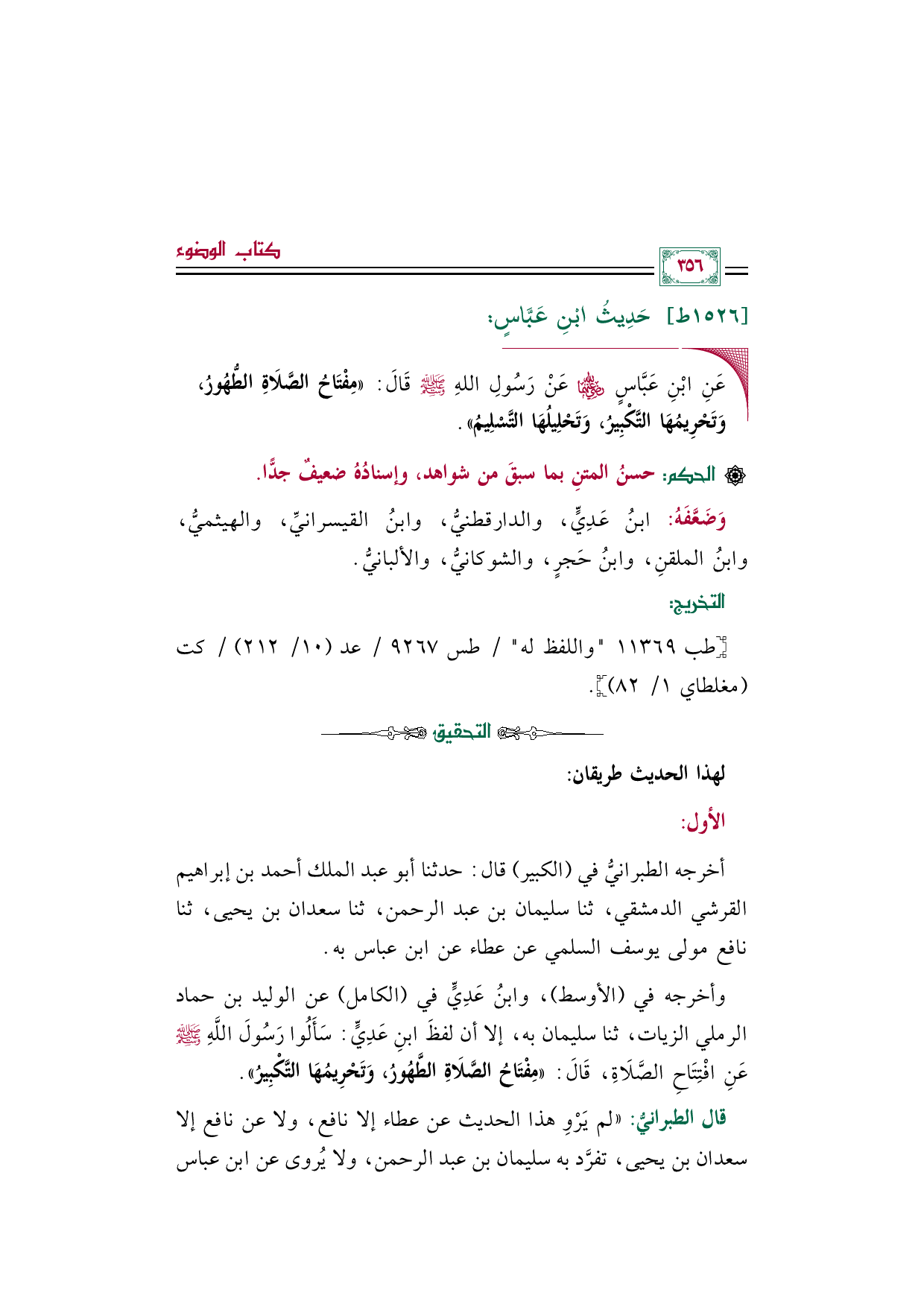 وأخرجه في (الأوسط)، وابنُ عَدِيٍّ في (الكامل) عن الوليد بن حماد الرملي الزيات، ثنا سليمان به، إلا أن لفظَ ابنِ عَدِيٍّ: سَأَلُوا رَسُولَ اللَّهِ صلى الله عليه وسلم عَنِ افْتِتَاحِ الصَّلَاةِ، قَالَ: «مِفْتَاحُ الصَّلَاةِ الطَّهُورُ، وَتَحْرِيمُهَا التَّكْبِيرُ».