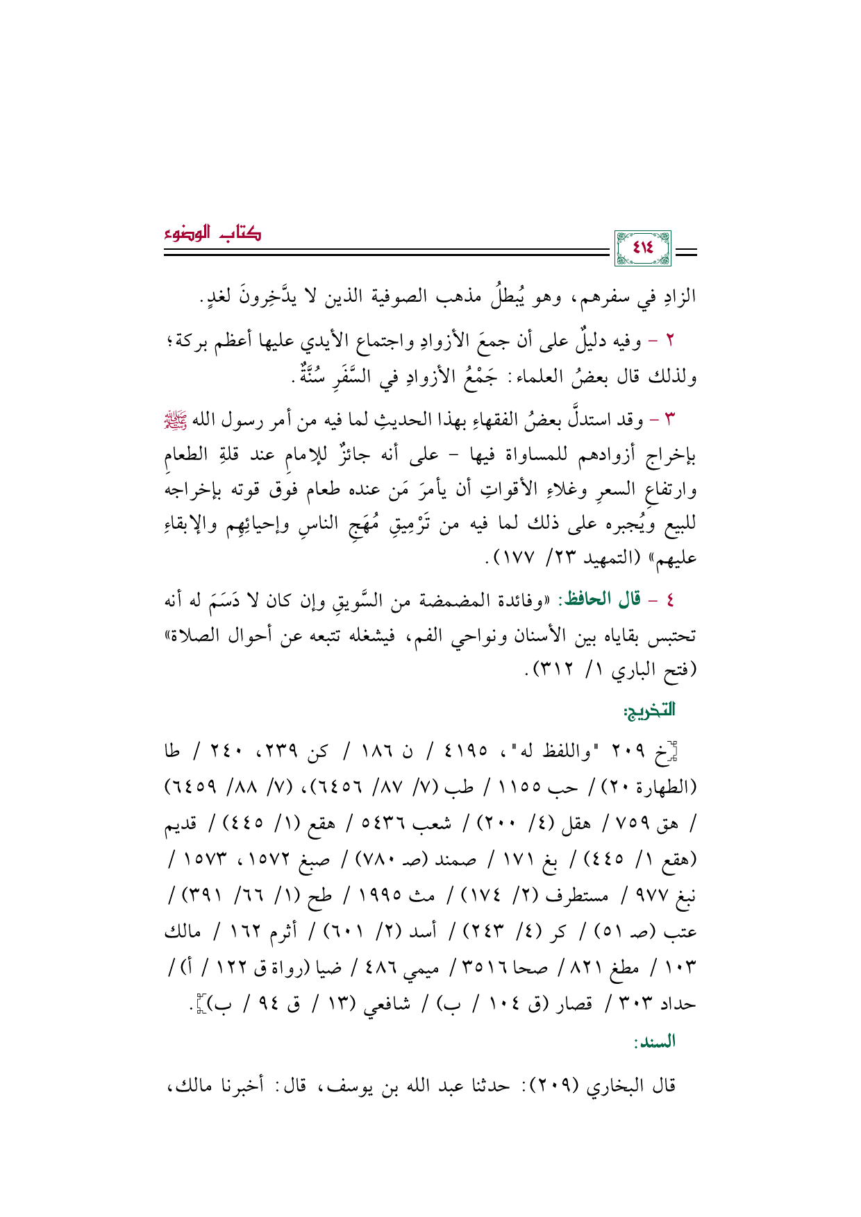 ٣ - وقد استدلَّ بعضُ الفقهاءِ بهذا الحديثِ لما فيه من أمر رسول الله صلى الله عليه وسلم بإخراج أزوادهم للمساواة فيها- على أنه جائزٌ للإمامِ عند قلةِ الطعامِ وارتفاعِ السعرِ وغلاءِ الأقواتِ أن يأمرَ مَن عنده طعام فوق قوته بإخراجه للبيع ويُجبره على ذلك لما فيه من تَرْمِيقِ مُهَجِ الناسِ وإحيائِهِم والإبقاءِ عليهم" (التمهيد ٢٣/ ١٧٧).